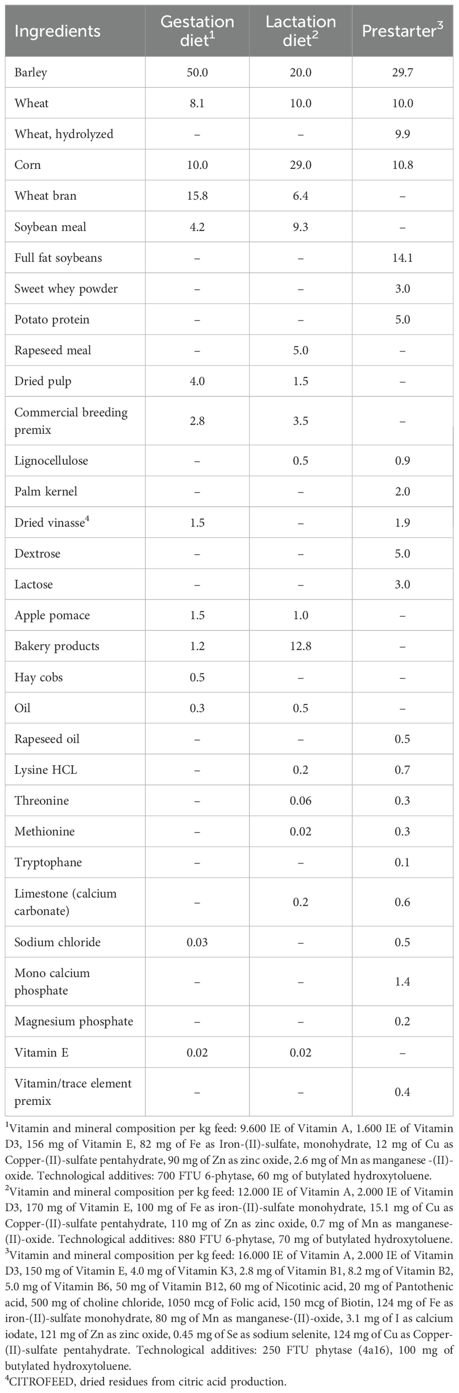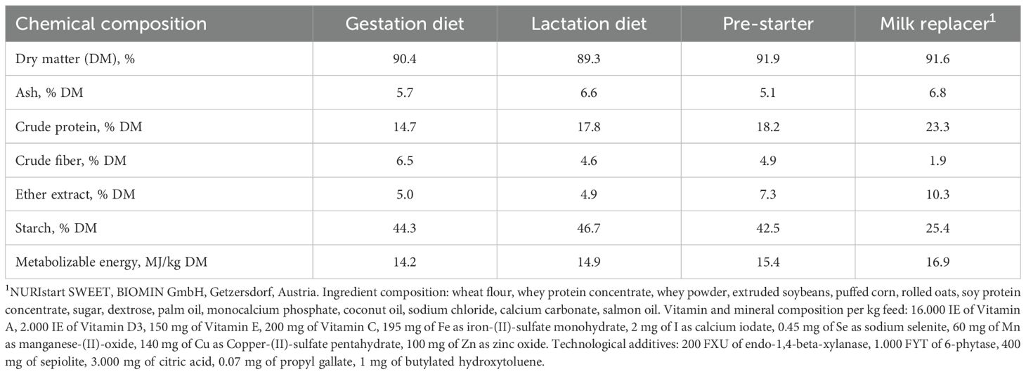 Piglets could suckle freely during the suckling period of 28 days. The milk replacer (NuriStart Sweet, BIOMIN Holding GmbH, part of dsm-firmenich, Getzersdorf, Austria; Table 2) was offered in liquid form from day 3 to 23 of life by mixing the powder with warm water (45°C) at a ratio of 500 g/L (w/v) by hand. The stainless-steel feeders were cleaned before they were refilled with the liquid milk replacer. Each litter received a minimum of 1,000 mL per day (500 mL at 08:00 and 500 mL at 15:00 h), and more when piglets finished their portion. The milk replacer was gradually mixed with the prestarter diet from days 24 to 26 of life, starting with a ratio of 70:30 (w/w) on day 24, 50:50 (w/w) on day 25, and 30:70 (w/w) on day 26, respectively, and provided in mash form. After that, the litters were offered 100% of the prestarter diet as mash on day 27 and until weaning on day 28. It was fed in dry form after weaning from day 28 to 35 of life. The cereal-based prestarter diet was formulated to provide adequate nutrients from the week before weaning to one week after weaning (NRC, 2012). Intake of milk replacer was estimated on a pen basis during the suckling period (Yosi et al., 2024). The proximate nutrient composition of the feeds was analyzed by a commercial feed laboratory (Feed Laboratory Rosenau, Haag, Austria) according to standard procedures (Naumann and Bassler, 2012).