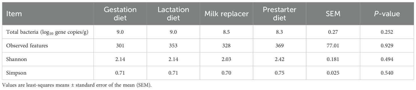 Table 4. Comparison of total bacterial gene copy numbers, species richness and diversity among feeds for sows and piglets.