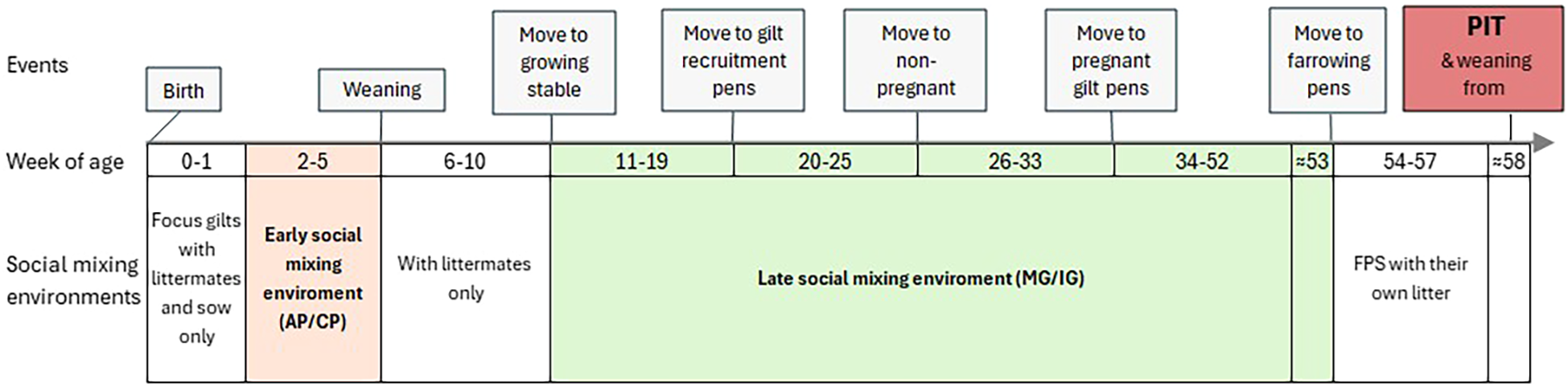 Experimental timeline from birth to the PIT performed after weaning of the first litter. Events above the axis mark key management events (birth, weaning, transfers to growing stable, gilt-recruitment stable, non-pregnant gilt pens and pregnant gilt pens and farrowing). Colored bands below the axis indicate the social-mixing treatments applied at each stage: early social mixing (AP, access pen or CP, closed pen) and late social mixing (MG= mixed group or IG, intact group).