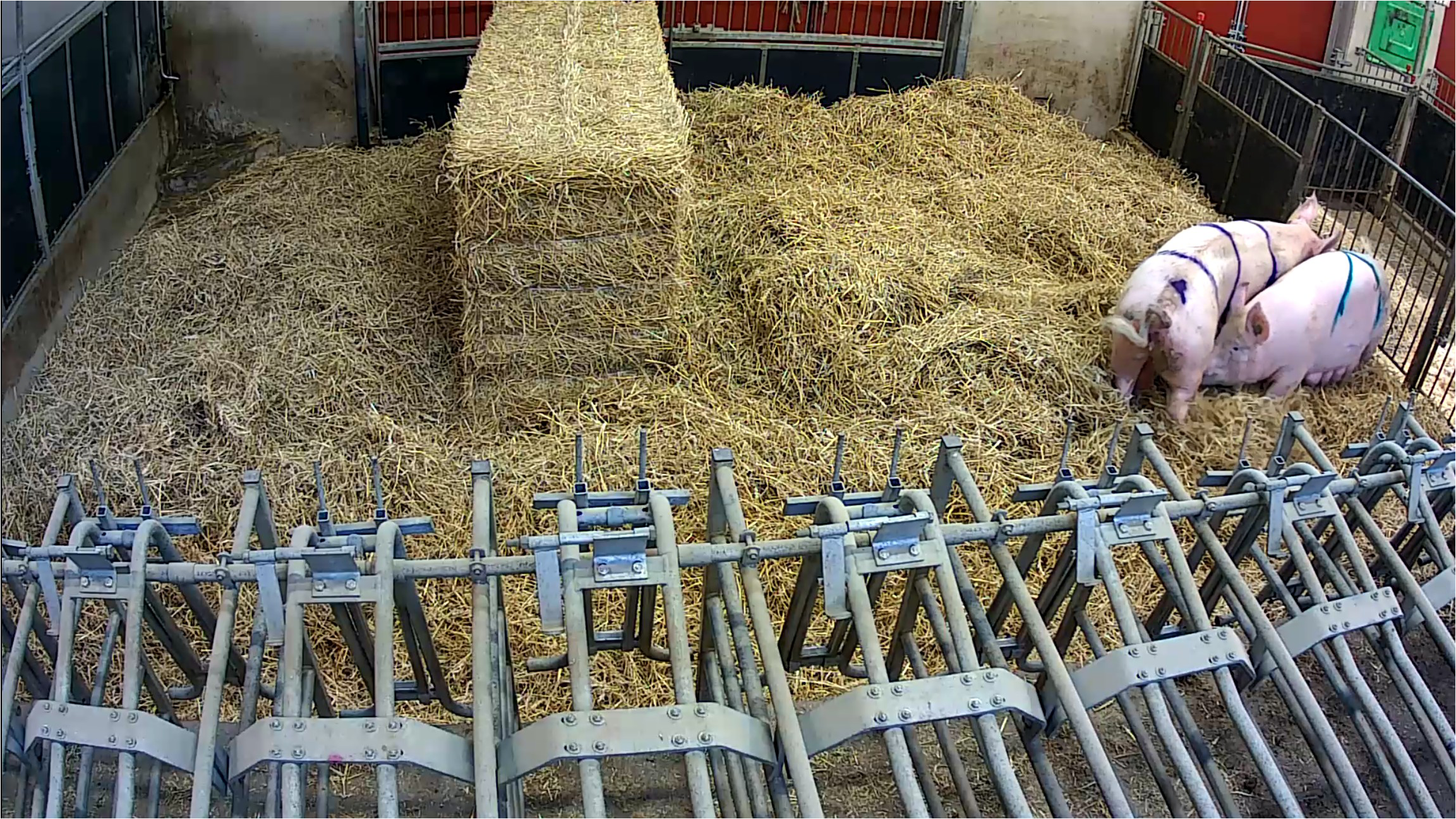 Picture of the right-hand pen of two access pens (APs), created from conventional loose housing farrowing pens, with a pop hole situated between the piglet corners in each pen. The image is reused from from Backeman Hannius et al. (2024), Animal 18:101349, under the CC BY 4.0 license.