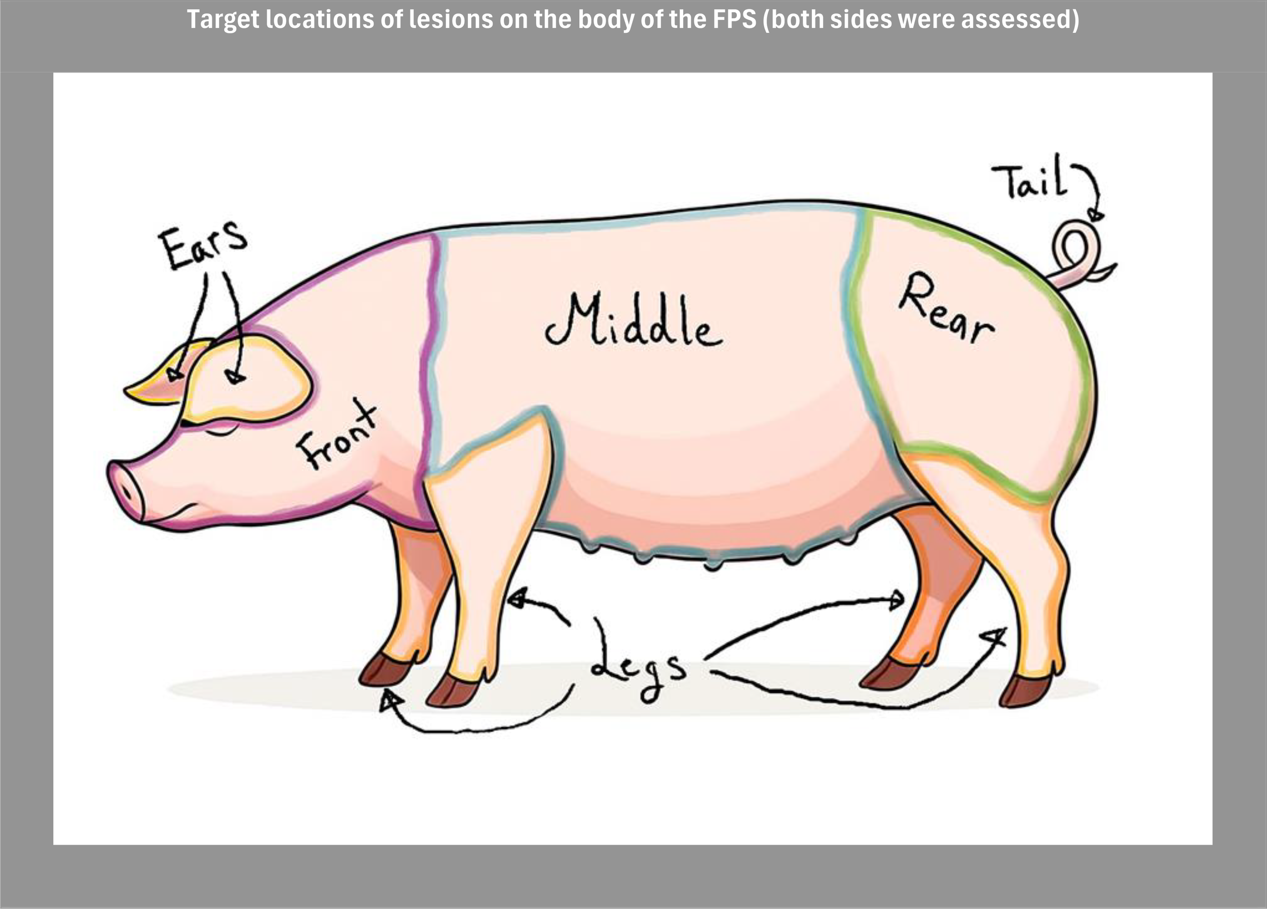 Illustration of the target locations assessed for skin lesions. Both left and right body sides were evaluated to account for potential asymmetries in lesion distribution. In the analysis, ears and front were grouped into a Front body region, and hindquarters and tail were grouped into a Rear body region.