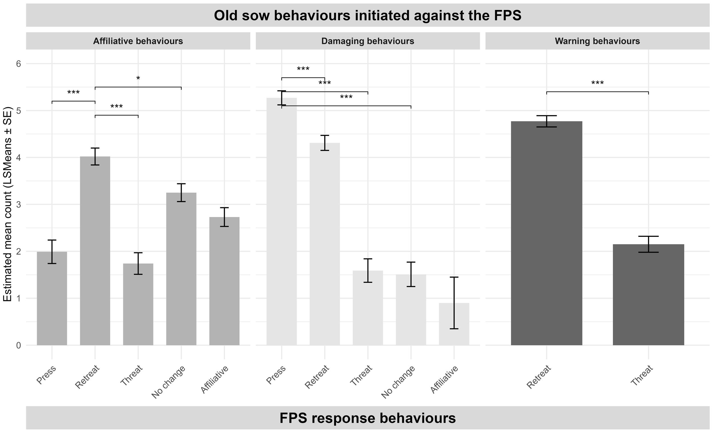 Because the focus of the study was on the FPSs’ responses, only the response behaviors of the FPS, not the older sow, were analyzed. Behaviors performed by the FPS as a response to the older sow’s behavior were grouped as follows: Affiliative behaviors and Damaging behaviors as described above; Inverse parallel pressing, Parallel pressing, and Press were aggregated as Pressing; and Mouth open, Climbing/riding, and Levering were aggregated as Other behaviors. Response behaviors such as Retreat, Threat, and No change in behavior were not grouped, as these represent distinct response strategies with different functional meanings and were analyzed separately.
