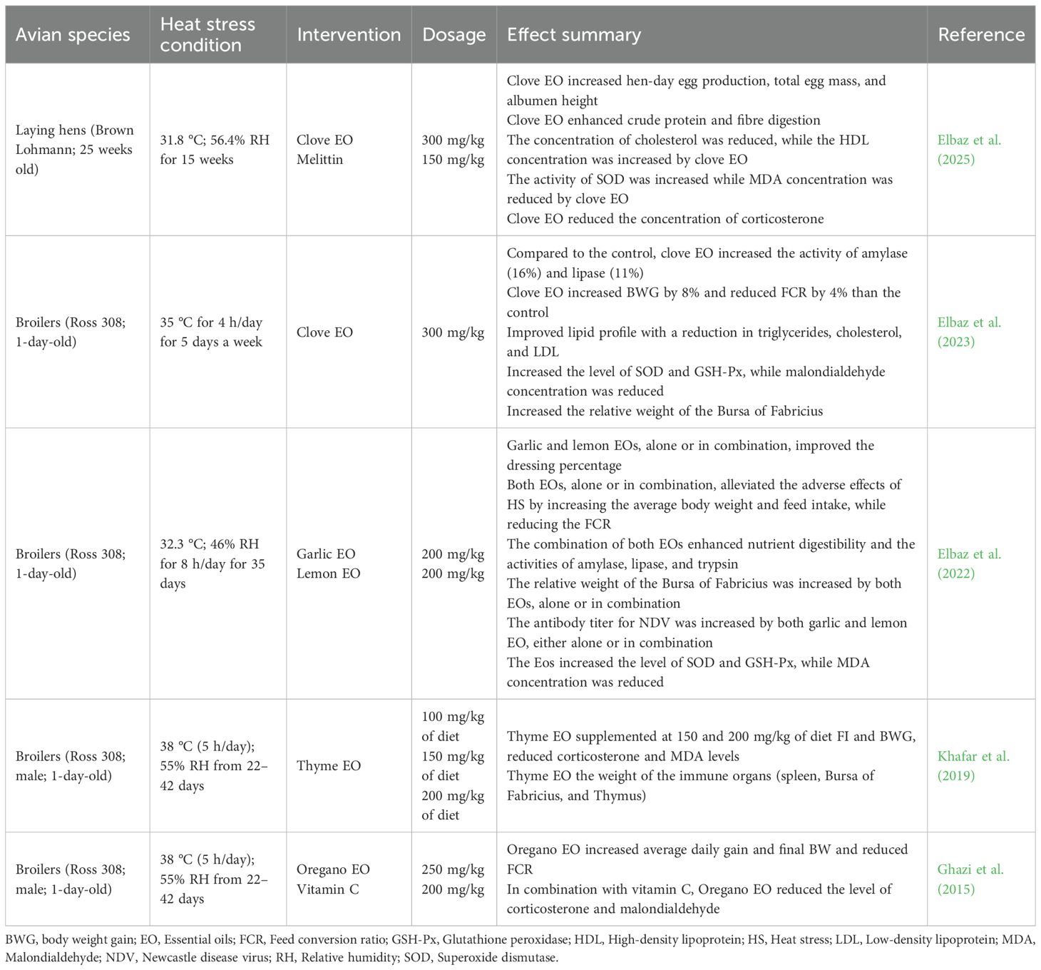 Heat stress adversely impacts growth by increasing FCR and mortality while decreasing BWG and FI. Many studies have demonstrated that supplementing EOs in poultry diets can counteract these effects. Studies have revealed that EOs improve BWG and reduce FCR in heat-stressed broilers (Ghazi et al., 2015; Khafar et al., 2019) and quails (Tekce et al., 2020). Tekce et al. (2020) observed that including 200 ppm of Moringa oleifera EO into the diet of heat-stressed Japanese quails improved BW, BWG, and FI, and decreased FCR. Also, Madkour et al. (2024) reported that compared with the unsupplemented heat-stressed broilers, offering 50 mg/kg of oregano extract significantly increased the BW and BWG and decreased the FCR by 10.20%, 9.92%, and 5.84%, respectively. In a 42-day study trial, Lippia origanoides EO and herbal betaine significantly improved BW and BWG of heat-stressed broilers (Senas-Cuesta et al., 2023). Supplementing oregano EO, alone or in combination with vitamin C, increased the average daily gain and final BW and decreased the FCR of broiler chickens (Ghazi et al., 2015). Khafar et al. (2019) demonstrated that supplementing thyme EO at 150 and 200 mg/kg mitigated the adverse effects of HS on FI, BWG, and FCR. The positive effects of EOs are attributed to their ability to stimulate the secretion of digestive enzymes, which enhances nutrient digestion and absorption (Elbaz et al., 2022, Elbaz et al., 2023).