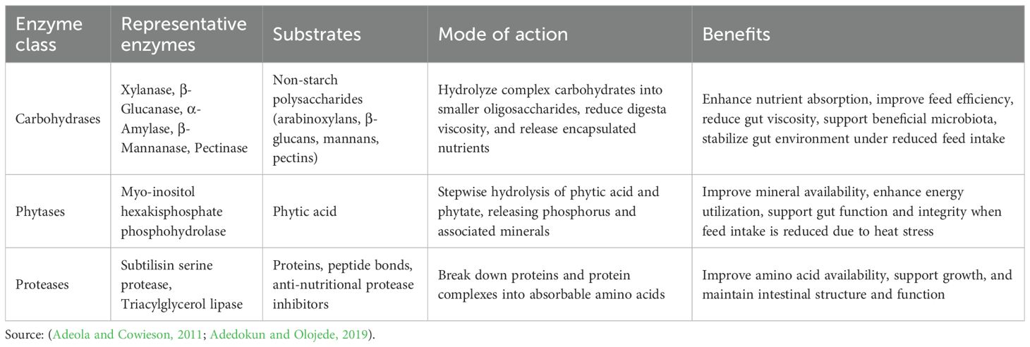 Table 4. Exogenous enzyme classes, their substrates, and potential benefits in mitigating heat stress in poultry.
