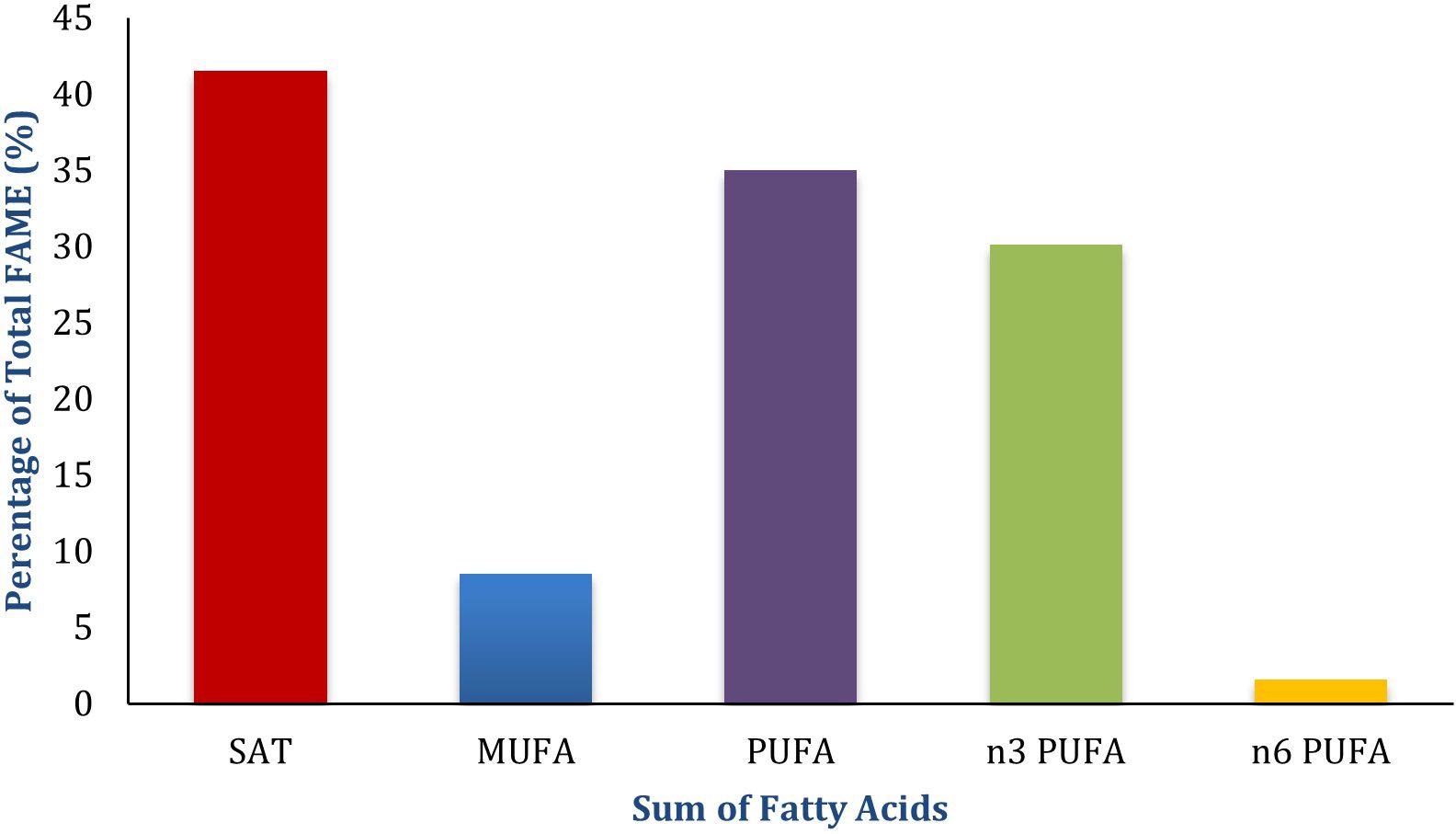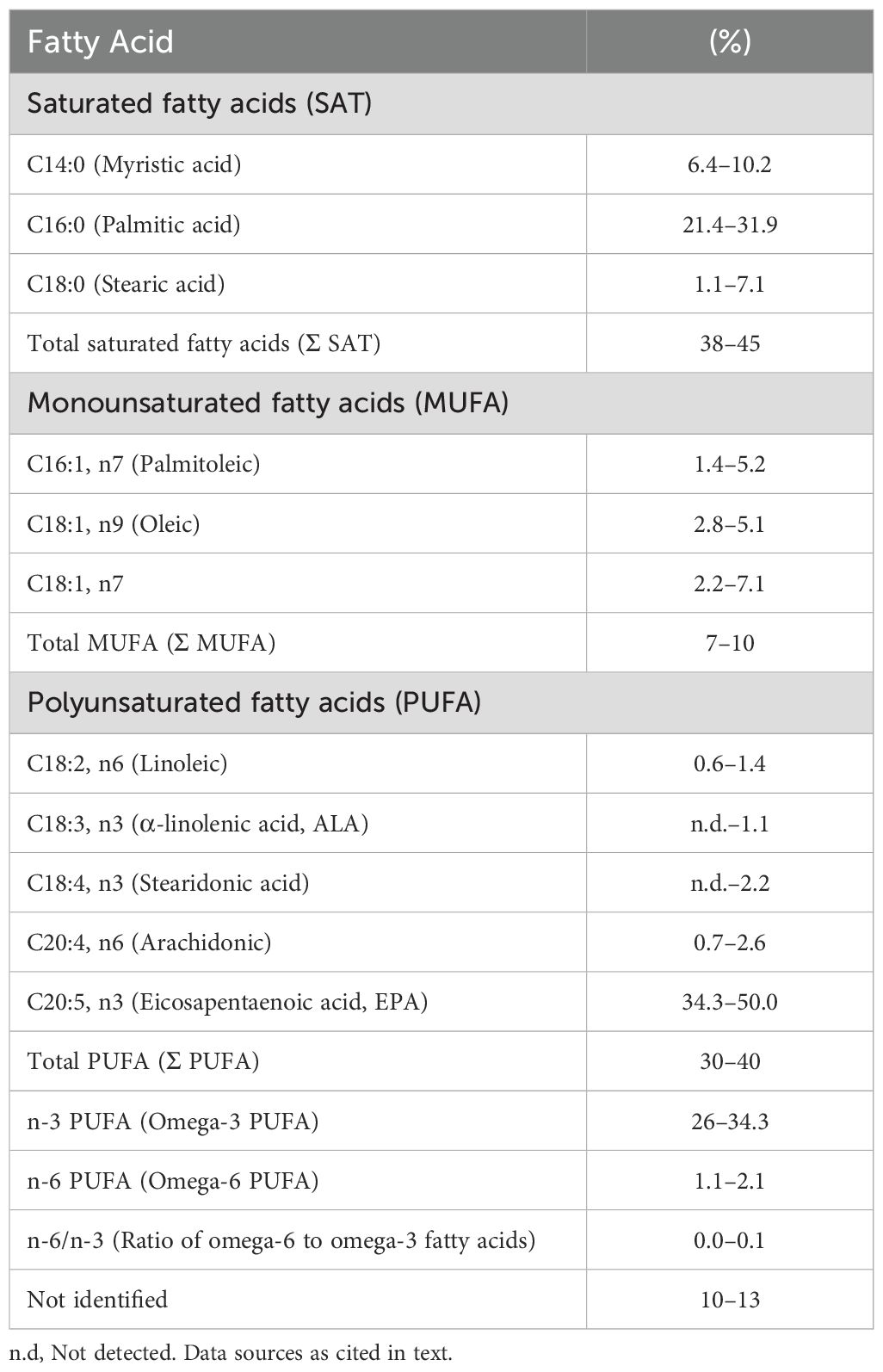 The fatty acid profile of P. palmata is characterised by a relatively high proportion of saturated fatty acids (ΣSAT 38–45% of total fatty acid methyl esters, FAME), with palmitic acid (C16:0, 23–31.9%) and myristic acid (C14:0, 6.4–10.2%) as the main contributors (Mishra et al., 1993; MacArtain et al., 2007; Mæhre et al., 2014). Monounsaturated fatty acids are present at modest levels (ΣMUFA 7–10%), primarily oleic acid (C18:1 n9). Polyunsaturated fatty acids (ΣPUFA 30–40%) are largely accounted for by eicosapentaenoic acid (EPA, C20:5 n3), which alone represents 34.3–47% of total FAME (Fleurence et al., 1994). This composition results in an exceptionally low n-6/n-3 ratio (≤0.1), uncommon among plant-derived feed ingredients.