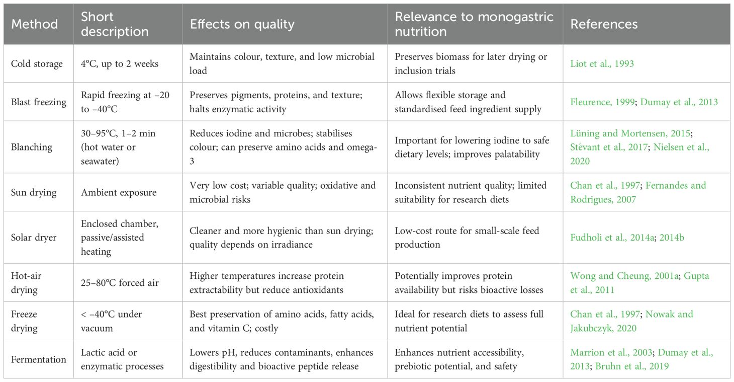 Table 1. Postharvest stabilisation and processing methods for P. palmata: effects on nutrient retention, quality, and relevance for monogastric feed.