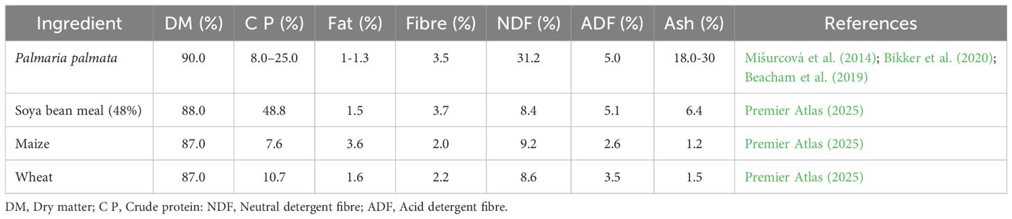 Interest in its application as feedstuff for monogastric animals has grown as part of broader efforts to identify sustainable, circular feed ingredients that can reduce dependence on imported protein sources (Makkar et al., 2016; Øverland et al., 2019). Using locally available P. palmata could enhance feed security, diversify raw material supply chains, and lower the environmental footprint of feed production. This advantage stems from its ability to grow in coastal environments without competing for arable land or freshwater, making it particularly attractive within circular economy frameworks. However, integrating P. palmata into practical feeding strategies also presents challenges, including variability in composition due to seasonality and geography, the presence of undesirable substances such as heavy metals and iodine, and the need for effective processing methods to ensure feed safety and nutrient bioavailability (Holdt and Kraan, 2011; Moroney et al., 2014; Cherry et al., 2019; Stévant et al., 2023).