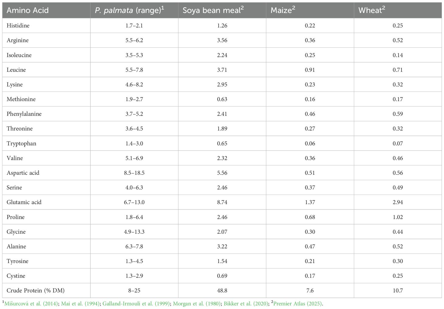 Beyond crude protein levels, the amino acid profile of P. palmata is notable for its richness in essential amino acids (EAAs), which often exceed those found in animal feed (Table 3). Lysine (4.6–8.2% of CP) and methionine (1.9–2.7% of CP) are particularly abundant, exceeding levels in soya bean meal (2.95% and 0.63%) or cereals such as maize (0.23% and 0.16%) and wheat (0.32% and 0.17%) (Mišurcová et al., 2014; Galland-Irmouli et al., 1999; Morgan et al., 1980; Mai et al., 1994; Bikker et al., 2020). Branched-chain amino acids are also present at relatively high levels, with isoleucine (3.5–5.3% of CP), leucine (5.5–7.8%), and valine (5.1–6.9%) all exceeding values in soya bean meal (2.24%, 3.71%, 2.32%). Among the non-essential amino acids, aspartic acid (8.5–18.5%) and glutamic acid (6.7–13.0%) dominate, contributing to the characteristic umami flavour of P. palmata (Galland-Irmouli et al., 1999; Mišurcová et al., 2014). Glycine (4.9–13.3%), alanine (6.3–7.8%), and tyrosine (1.3–4.5%) are also present at higher concentrations than in conventional feedstuffs. However, some amino acids, such as cystine, histidine, and tryptophan, tend to occur at lower relative levels, which may represent potential limiting factors when formulating balanced diets.