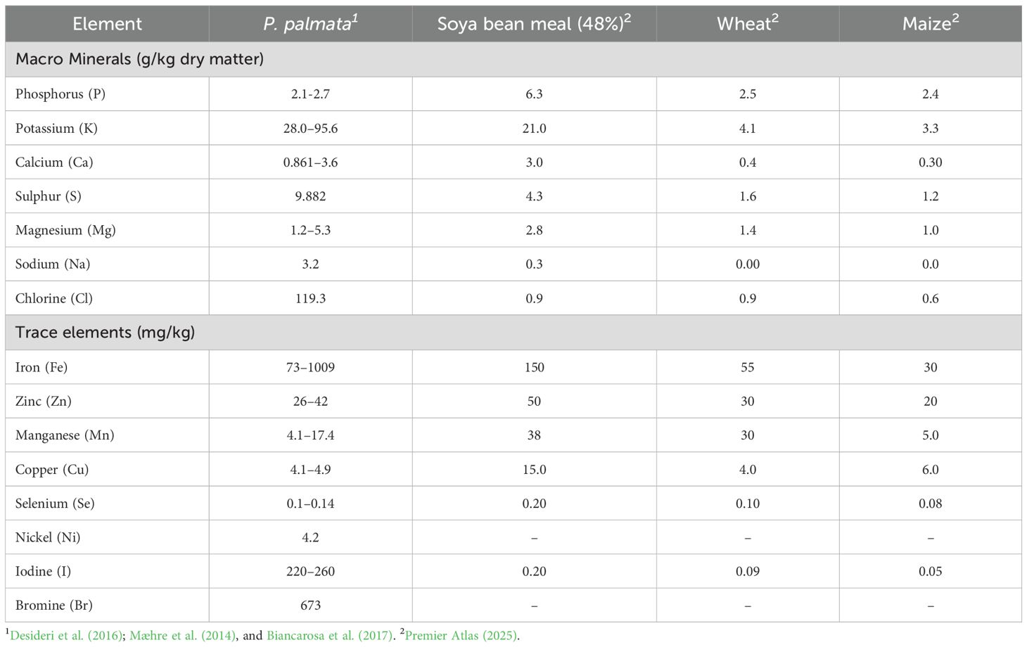 In addition to its mineral richness, P. palmata contains significant amounts of riboflavin (B2), niacin (B3), vitamin C, vitamin E, and provitamin A (Kraan, 2013; Mabeau and Fleurence, 1993). Table 5 presents the mineral composition of P. palmata relative to soya bean meal, maize, and wheat, highlighting its superior density of both macro- and micro-minerals compared with animal feed.