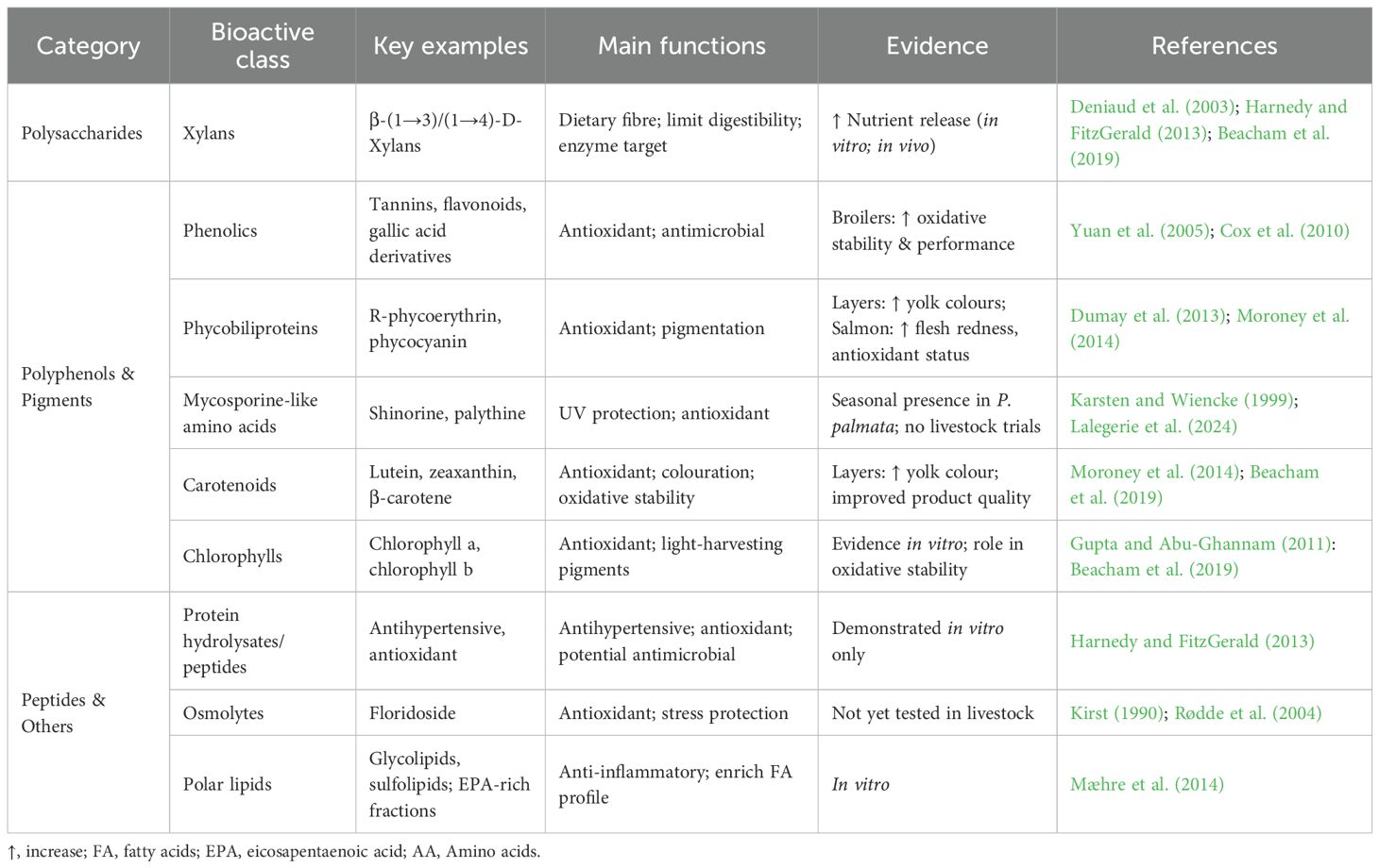 P. palmata contains a wide array of bioactive compounds, including sulphated polysaccharides, phenolics, carotenoids, phycobiliproteins, and peptides, which together underpin antioxidant, antimicrobial, immunomodulatory, and metabolic activities relevant to animal health and product quality (Holdt and Kraan, 2011; Lordan et al., 2011; Harnedy and FitzGerald, 2013; Cherry et al., 2019; Xu et al., 2024). These compounds are increasingly recognised for their potential roles in supporting gut function, modulating the immune system, and enhancing oxidative stability in livestock products. However, their concentration and activity vary considerably depending on season, harvest site, and processing method (Karsten and Wiencke, 1999; Lalegerie et al., 2024).