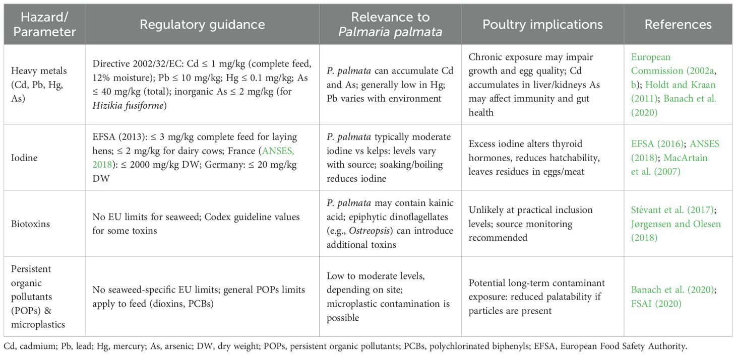 In the EU, seaweeds used as feed materials are regulated under Directive 2002/32/EC (2002a) to control undesirable substances in animal feed. For red seaweeds, such as P. palmata, the most relevant legally controlled chemical hazards are heavy metals and iodine, while microbiological, viral, and physical hazards are managed under general hygiene law and national specifications.