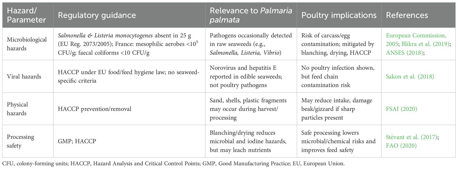 Collectively, these risks emphasise the importance of HACCP-based hygiene management, validated processing methods (e.g., blanching, drying, fermentation), and site-specific monitoring to ensure compliance with EU/UK legislation and safe inclusion of P. palmata in poultry diets.