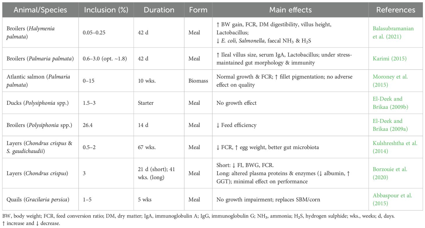 While regulatory frameworks establish safety boundaries, feeding trials provide essential evidence of how seaweeds function as practical feed ingredients by identifying safe upper limits, that is, inclusion levels at which no significant negative impacts on production parameters are observed. Several red seaweeds have been evaluated in poultry with variable but informative outcomes. Across studies, low dietary inclusion levels of red seaweeds appear well tolerated, whereas higher levels can have mixed effects depending on species. For example, Polysiphonia spp. at 1.5–3% of the diet had no effect on duck growth, but a much higher level (26.4%) reduced feed efficiency in broilers (El-Deek and Brikaa, 2009a, b). In quails, supplementation with the red alga Gracilariopsis persica at 1–5% of the diet did not impair growth or egg production but improved egg quality by lowering serum and yolk cholesterol, reducing yolk malondialdehyde concentrations, and enhancing lipid-related indices such as the ratio of high-density lipoprotein to low-density lipoprotein cholesterol (Abbaspour et al., 2015). Similarly, in layers, dietary inclusion of the red seaweeds Chondrus crispus and Sarcodiotheca gaudichaudii at 1–2% improved egg weight and feed efficiency, while also enhancing gut health through increased counts of beneficial lactic acid bacteria and reduced coliforms such as Escherichia coli (Kulshreshtha et al., 2014). Collectively, these examples highlight the broader potential of red seaweeds as functional feed ingredients, though outcomes vary with inclusion level and host species.