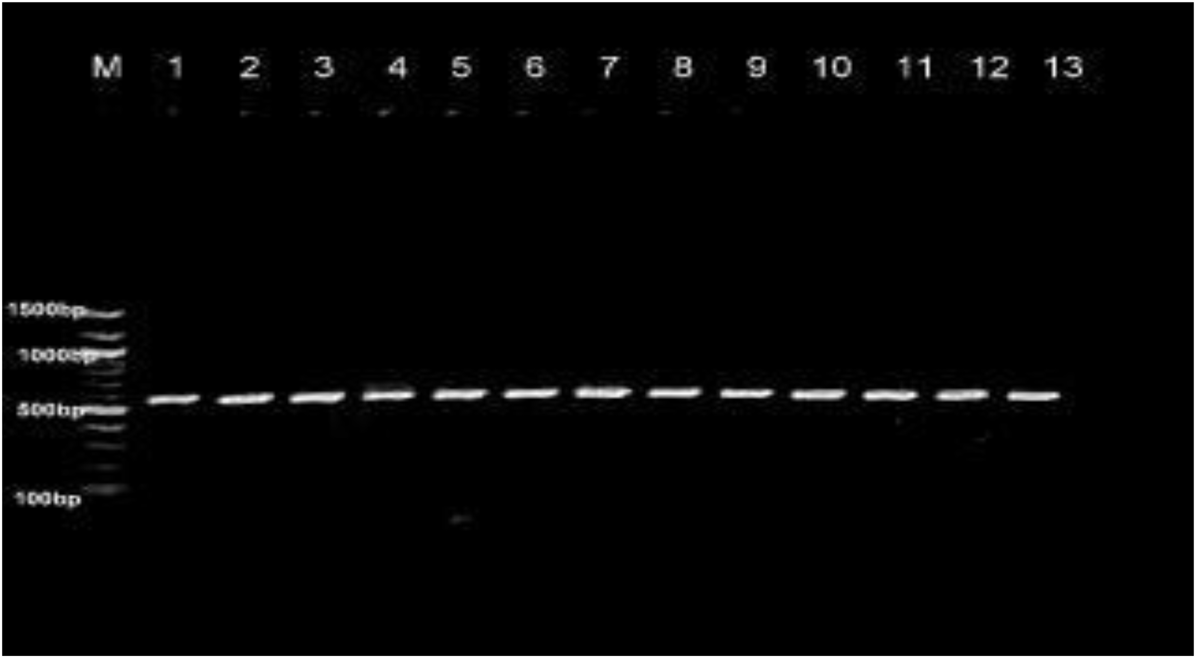 Gel image of representative amplicons produced by the primers used. M is the maker used (100 bp ladder); lanes 1 to 13 are positive samples.