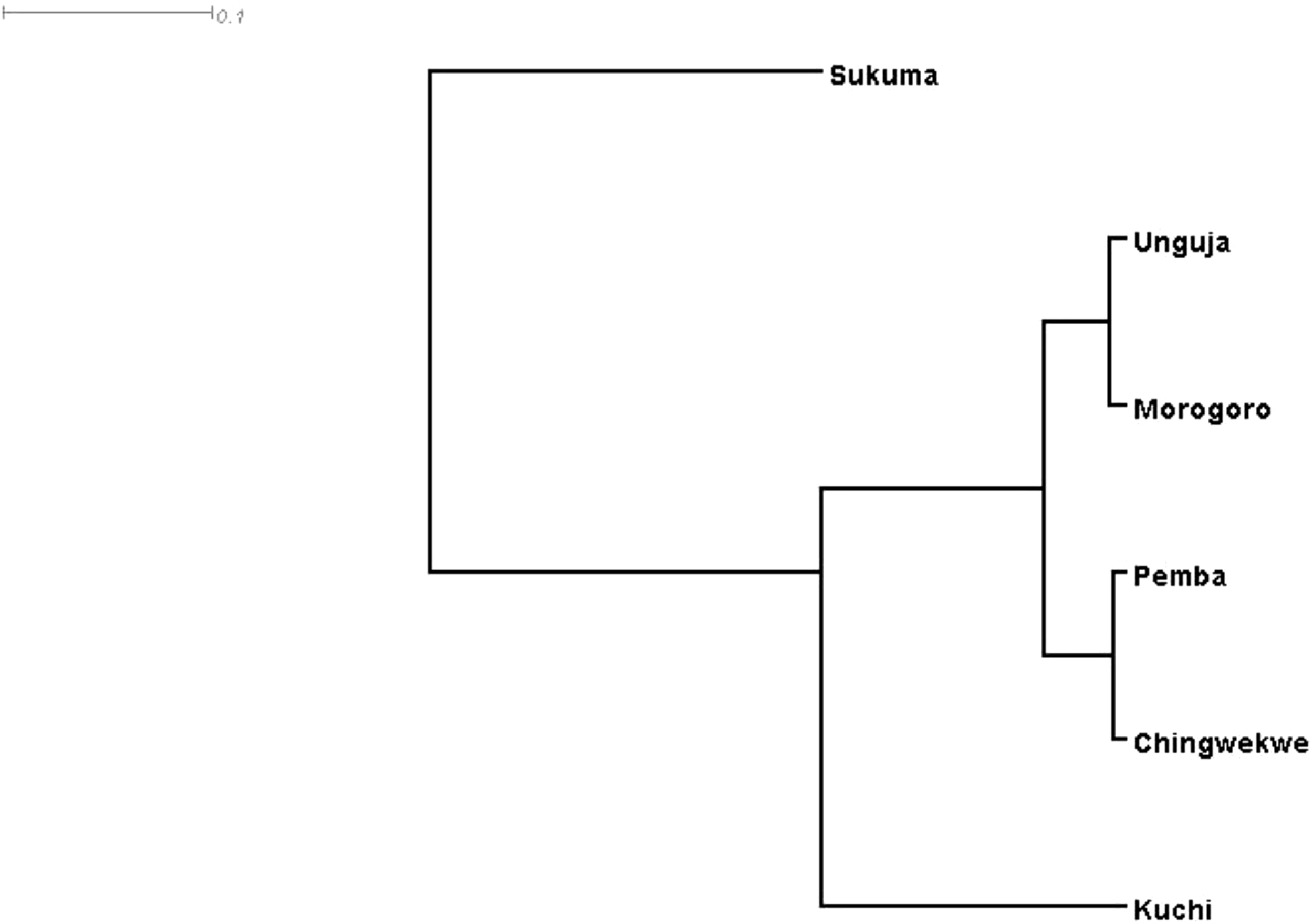 Phylogenetic tree generated from FST pairwise difference, showing the clustering relationships among the six Tanzanian indigenous chicken populations.