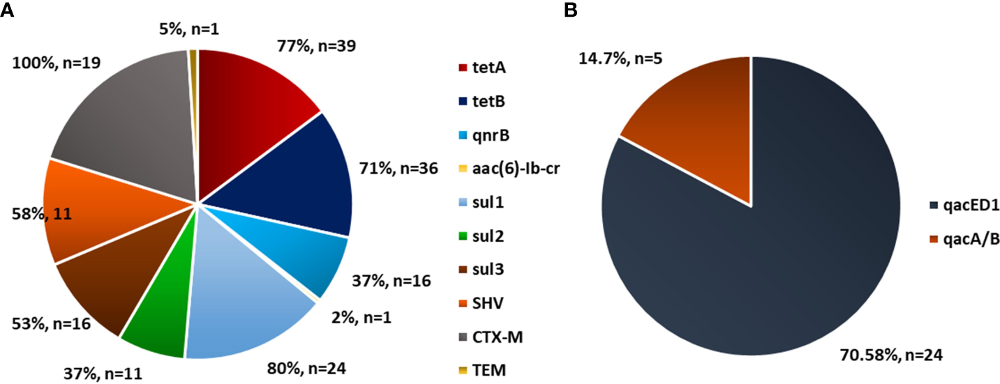 Figure 5 Prevalence of antibiotic resistance gene in Escherichia coli in poultry. Source: (A) Mclver et al. (2020), n=174 and (B) Ibrahim et al. (2019), n=34.