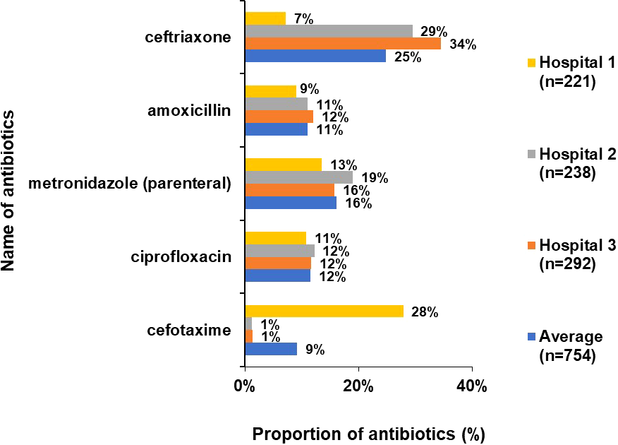 Overall, third generation cephalosporins (ceftriaxone, cefotaxime), amoxicillin, metronidazole (parenteral) and ciprofloxacin accounted for more than 75% of total prescriptions. While Hospital 2 and 3 had the same trend in the ATC5 level antibiotics, Hospital 1 showed very high cefotaxime use (28%) instead of ceftriaxone (7%). (Figure 5).