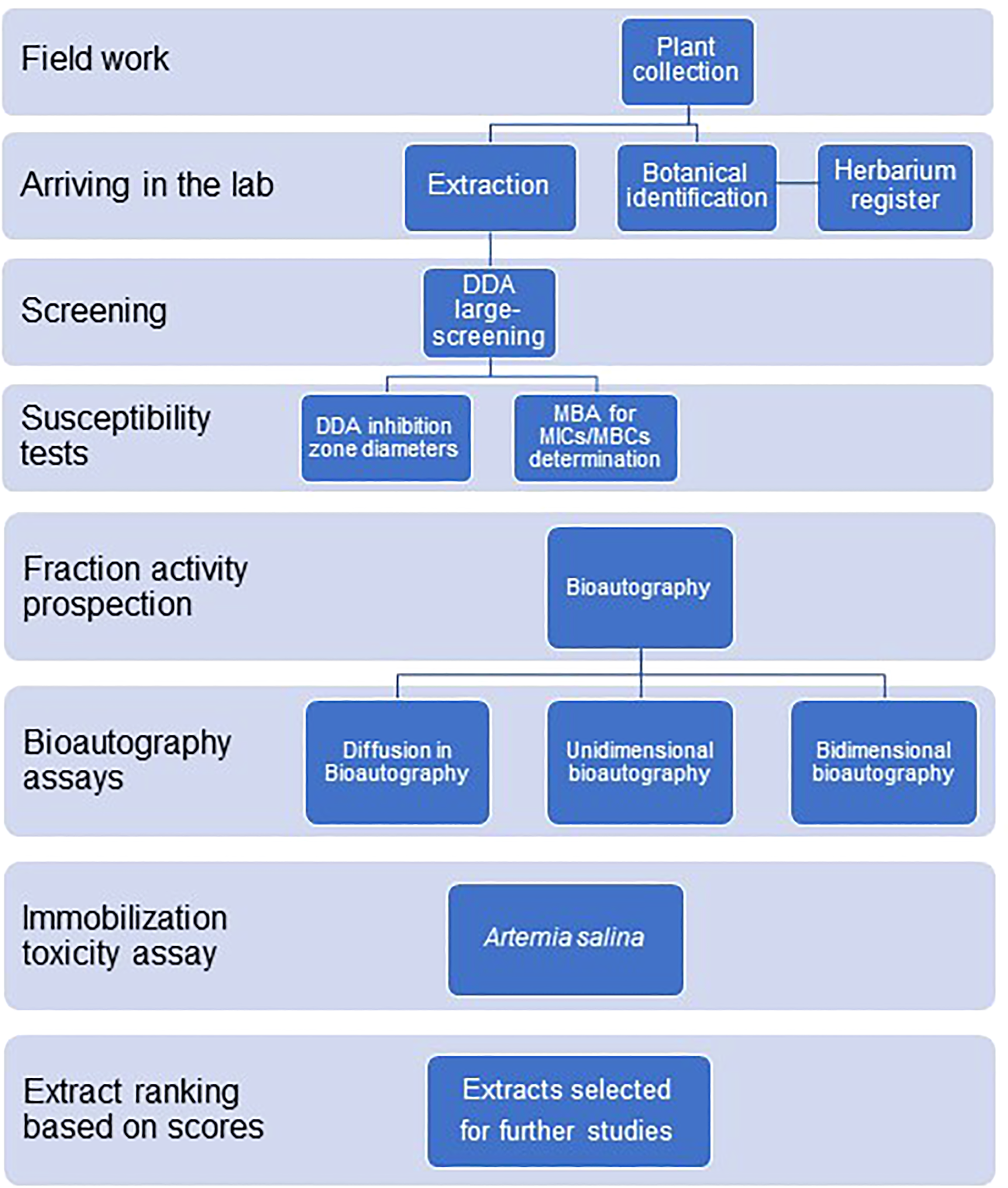 Figure 2 Experimental design for the antimicrobial large-scale screening of plant extracts from the Amazon rainforest and the Atlantic forest.