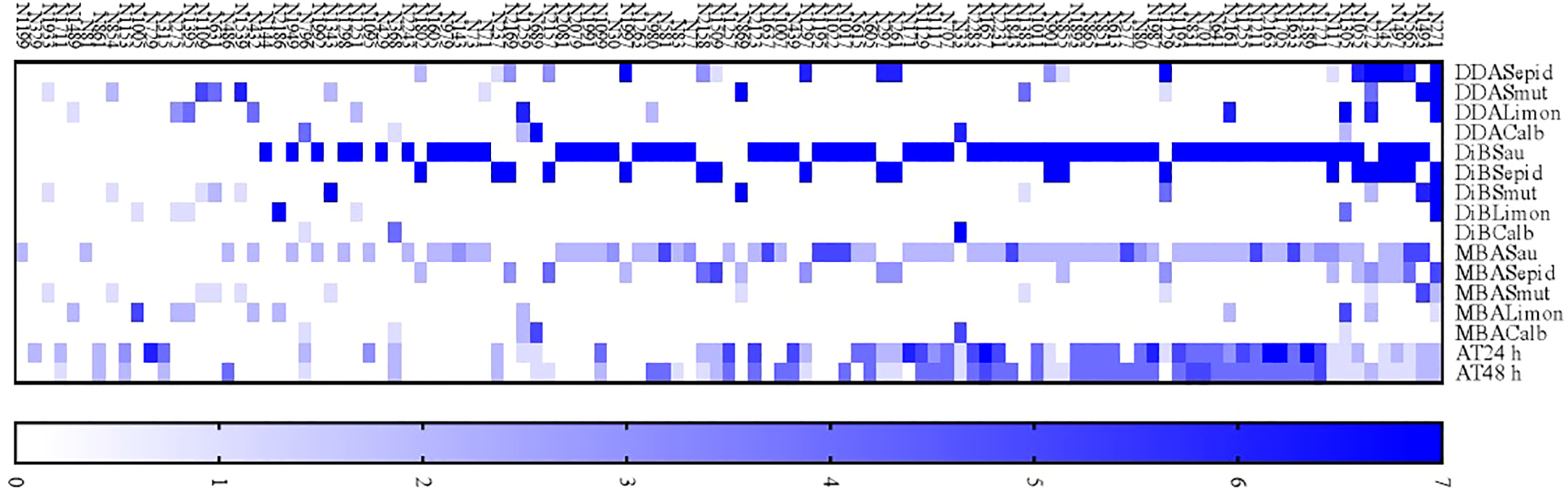 MBA scores were attributed to the minimum bactericidal concentrations obtained based on six 1/2-fold dilutions starting from 10 mg/mL. Scores from 1 to 5 were given (where 1 indicated the highest MBC, and 5 the lowest).