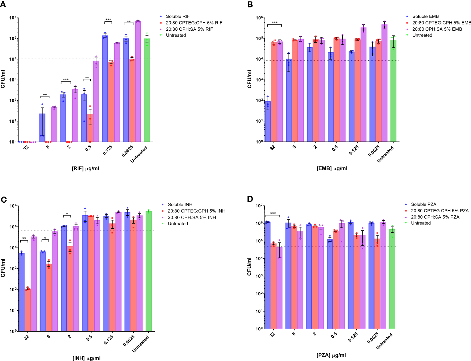 M. marinum drug sensitivity profiles for rifampicin and other antibiotics in broth culture media. Drug susceptibility of M. marinum in broth culture media after 48 h exposure to (A) rifampicin (RIF), (B) ethambutol (EMB), (C) isoniazid (INH), and (D) pyrazinamide (PZA) as a single dose of soluble drug or encapsulated in CPTEG:CPH or CPH:SA nanoparticles. All data are presented as colony-forming units per mL. The data shown are representative of similar experiments conducted in triplicate. The results of a Student’s t-test comparing values for soluble drugs at each concentration to nanoparticle values are indicated for corresponding p-values (* < 0.1, ** < 0.01 and *** < 0.001).