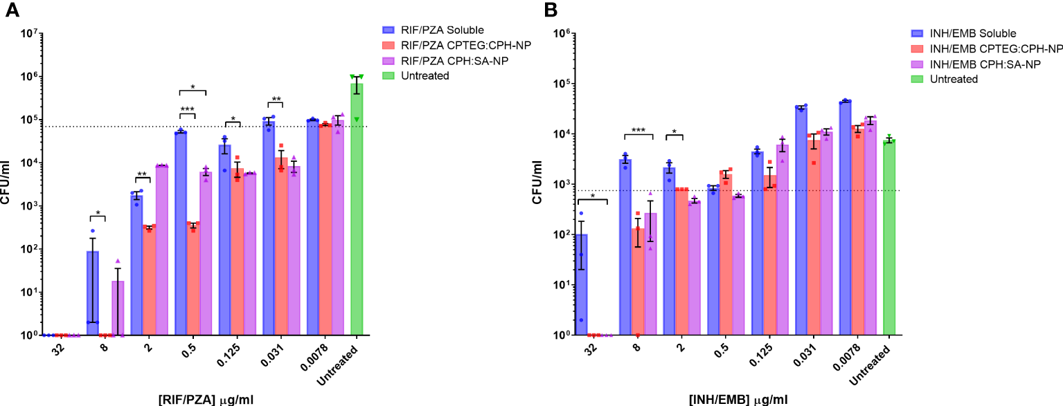 Evaluation of the antimicrobial activity of dual drug-loaded particles against M. marinum broth cultures. (A) CPTEG:CPH and CPH:SA, each with RIF/PZA. (B) CPTEG:CPH and CPH:SA, each with INH/EMB. Colony forming units per mL of M. marinum exposed to equivalent doses of soluble and nanoparticle (NP)-delivered antimicrobial compounds were enumerated at 48 h post-infection. The dotted line indicates the threshold value of MIC90 calculated from the average for each untreated group. The results of a Student’s t-test comparing the values for soluble drugs at each concentration to NP values are indicated for corresponding p-values (* < 0.1, ** < 0.01 and *** < 0.001).