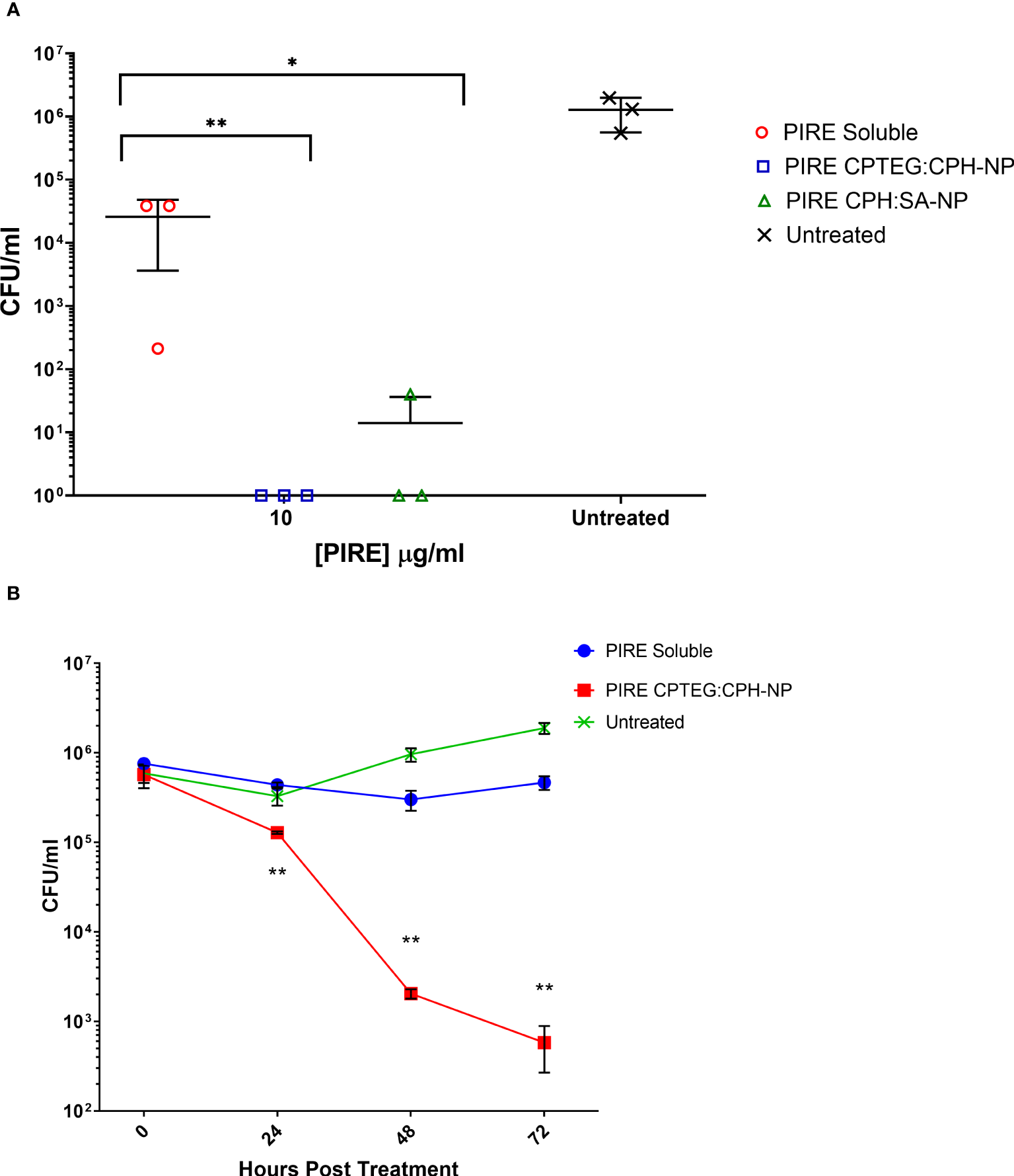 Intracellular targeting of nanoparticles (NPs) in M. marinum-infected macrophages. Monolayers of adherent human monocytes (THP-1 cells) were infected with M. marinum in a 10:1 ratio. Colony-forming units (CFU) were enumerated beginning with treatment at 48 h post-infection with either a soluble PIRE drug cocktail or an equivalent amount encapsulated within a 20:80 CPTEG:CPH NP. Intracellular bacterial viability was determined up to 72 h post-treatment, and Student’s t-tests were used to compare values for NP-encapsulated antimicrobials with those for soluble treatments (*p < 0.01 and **p < 0.01).