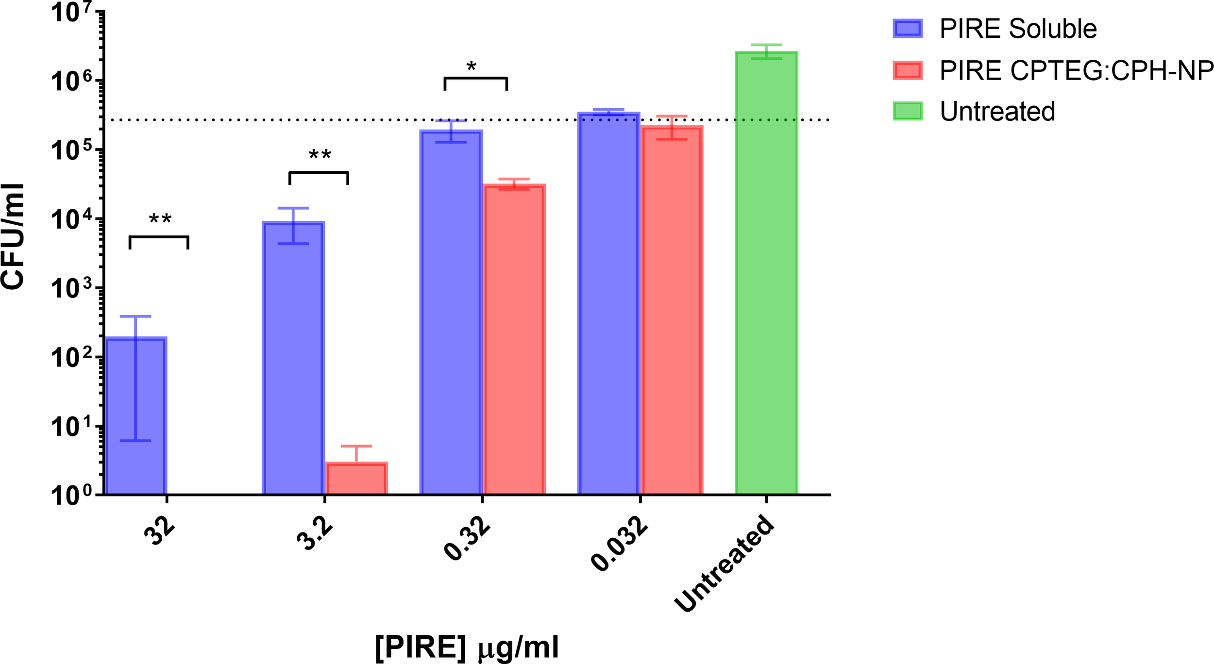 All subsequent experiments examined the benefits of NP formulation 20:80 CPTEG : CPH for the delivery of PIRE, as the largest antimicrobial benefits were recorded with this formulation. The PIRE antimicrobial cocktail labeled 10 μg/mL contained 10 μg/mL of each drug, i.e., 10 μg/mL of pyrazinamide, 10 μg/mL of isoniazid, 10 μg/mL of rifampicin, and 10 μg/mL of ethambutol. Results from the in vitro testing of M. marinum broth cultures demonstrated a significant increase in antimicrobial killing (Figure 3A) corresponding to fold increases of >10 for 0.32 μg/mL and >3,000 for 32 μg/mL compared with soluble drugs at 48 h (Table 1).