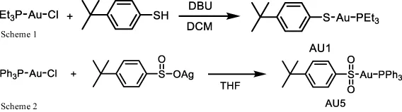 A solution of 1,8-diazabicyclo(5.4.0)undec-7-ene (DBU) (1.2 mmol) in 1 mL dichloromethane (DCM) was dropped into a solution of solution of chloro(triethylphosphine)gold(I) (1.0 mmol) and 4-tert-butylbenzenethiol (1.2 mmol) in 5 mL DCM. The mixture was stirred at 360 rpm at room temperature for 2 h. The mixture was then concentrated and subjected to column chromatography (30% ethyl acetate/hexane) to give AU1 (331 mg, 69% yield). NMR spectra were recorded for 1H NMR (400 MHz, CDCl3) δ 7.53 – 7.41 (d, J = 8.3 Hz, 2H), 7.17 – 7.08 (d, J = 8.3 Hz, 2H), 1.86 (q, 6H), 1.31 – 1.12 (m, 18H);13CNMR (100MHz, CDCl3) δ 146.4, 137.4, 132.2, 125.9, 34.1, 31.4, 18.2, 9.0; 31PNMR (162 MHz, CDCl3) δ 37.21 (Scheme 1).