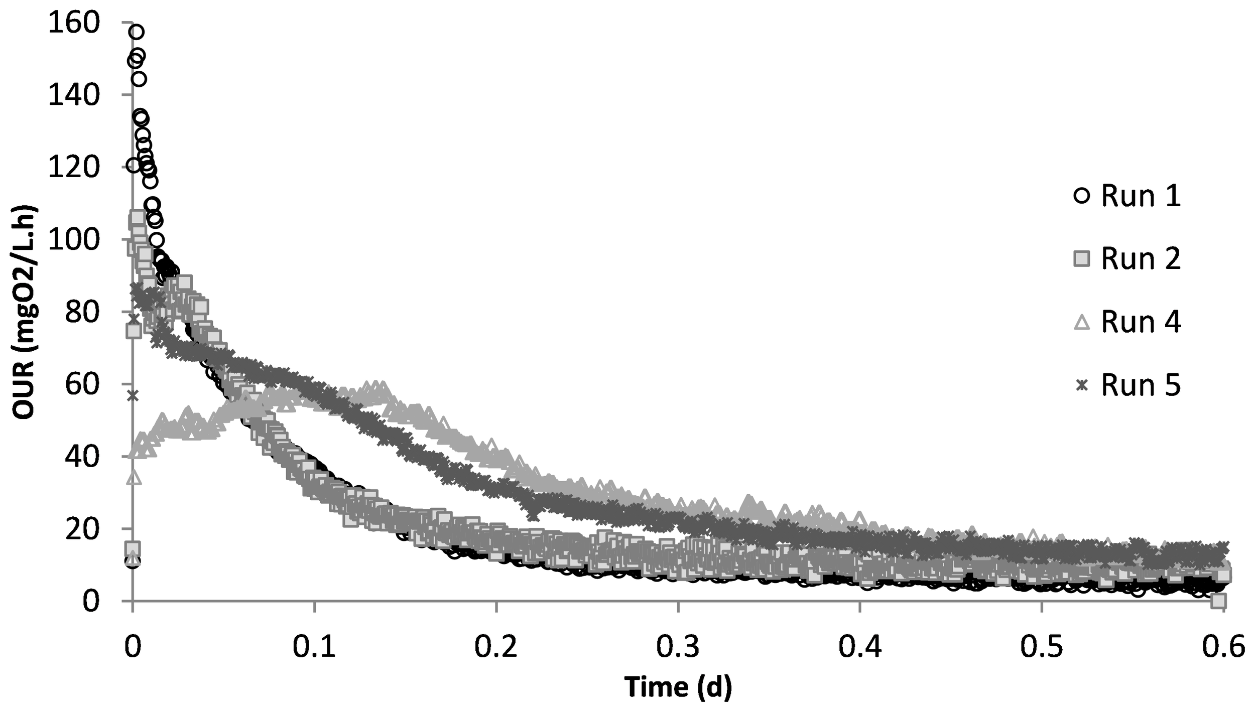 Oxygen uptake rate (OUR) profiles obtained from different experimental runs.