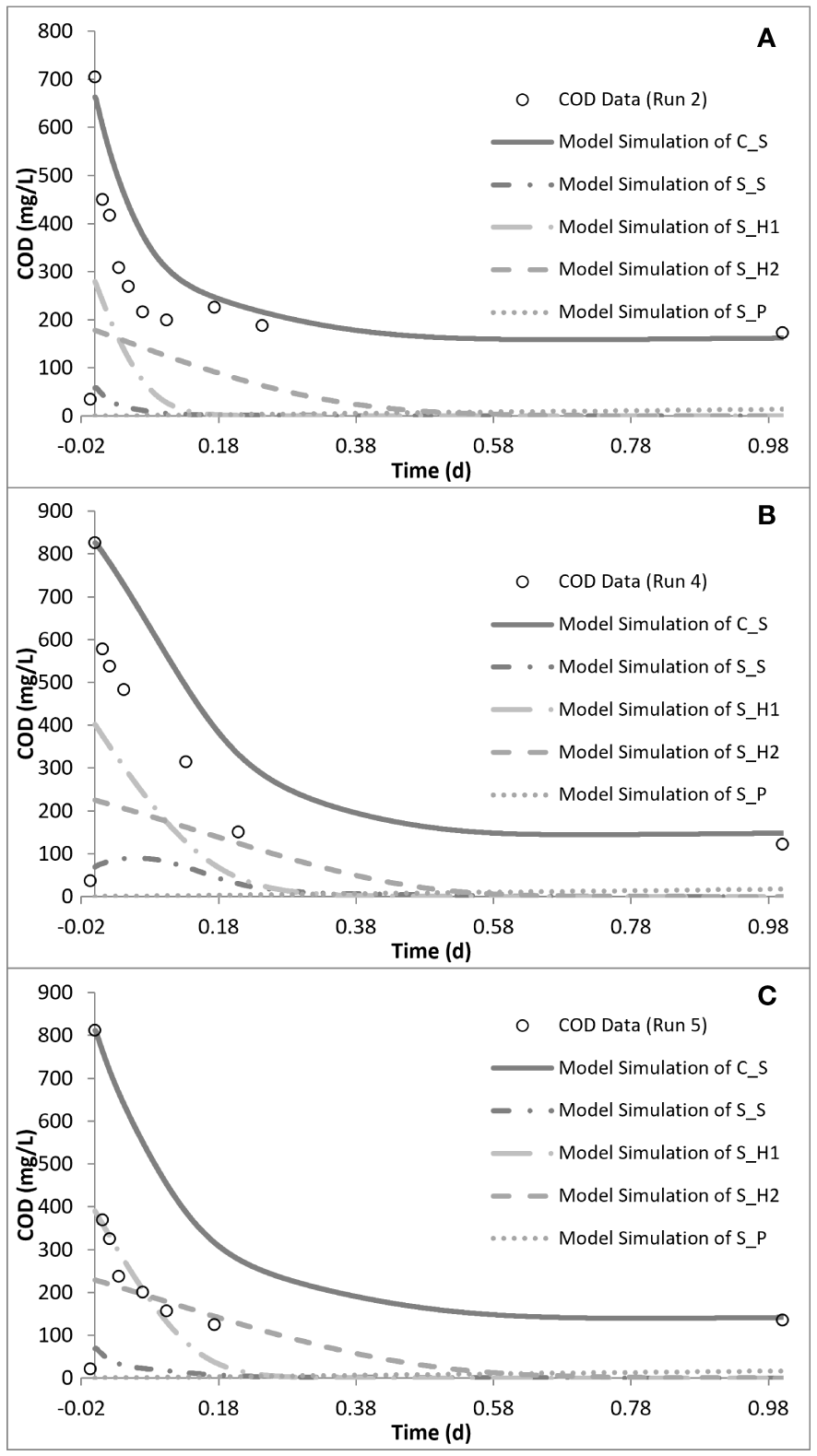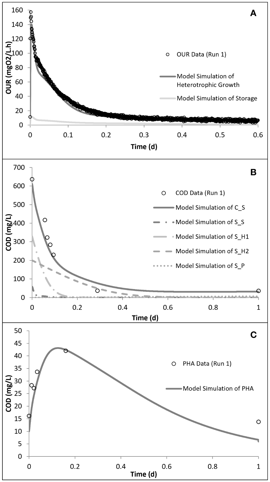 Model simulation of run 1: oxygen uptake rate (OUR) (A), chemical oxygen demand (COD) removal (B), and polyhydroxyalkanoate (PHA) storage (C) profiles. Reproduced from Pala-Ozkok et al. (2012, 2019).