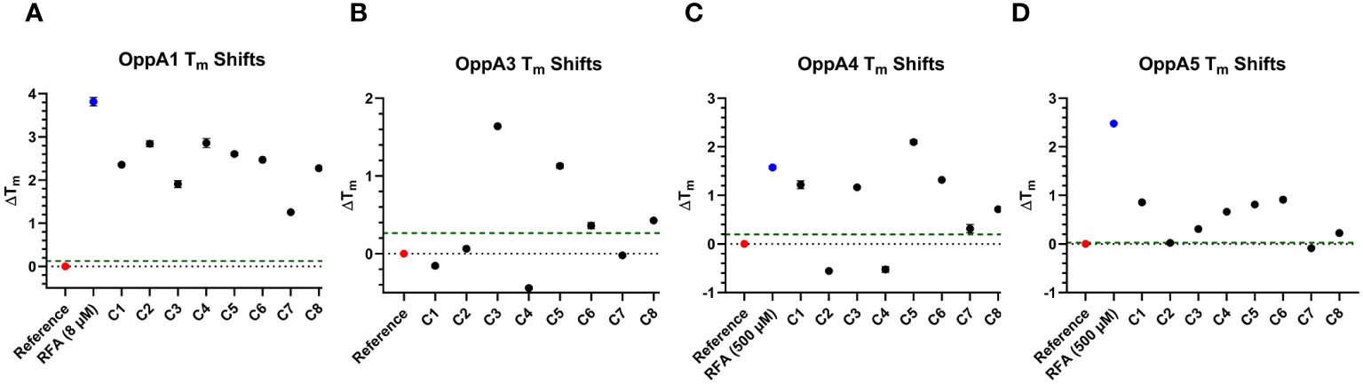 where σr and σp are the standard deviations of Tm of the reference and positive controls, respectively, and where μr and μp are the means of the Tm of the reference and positive controls, respectively. Concentrations of RFA that produced an OppA Tm shift yielding a Z′-factor >0.5 were selected as the designated RFA concentrations to be used in the high-throughput compound screen. The concentrations of RFA selected for use in TSA screening were 8 μM for OppA1 and OppA2 and 500 μM for OppA4 and OppA5. No concentration of RFA was found to shift the OppA3 Tm.