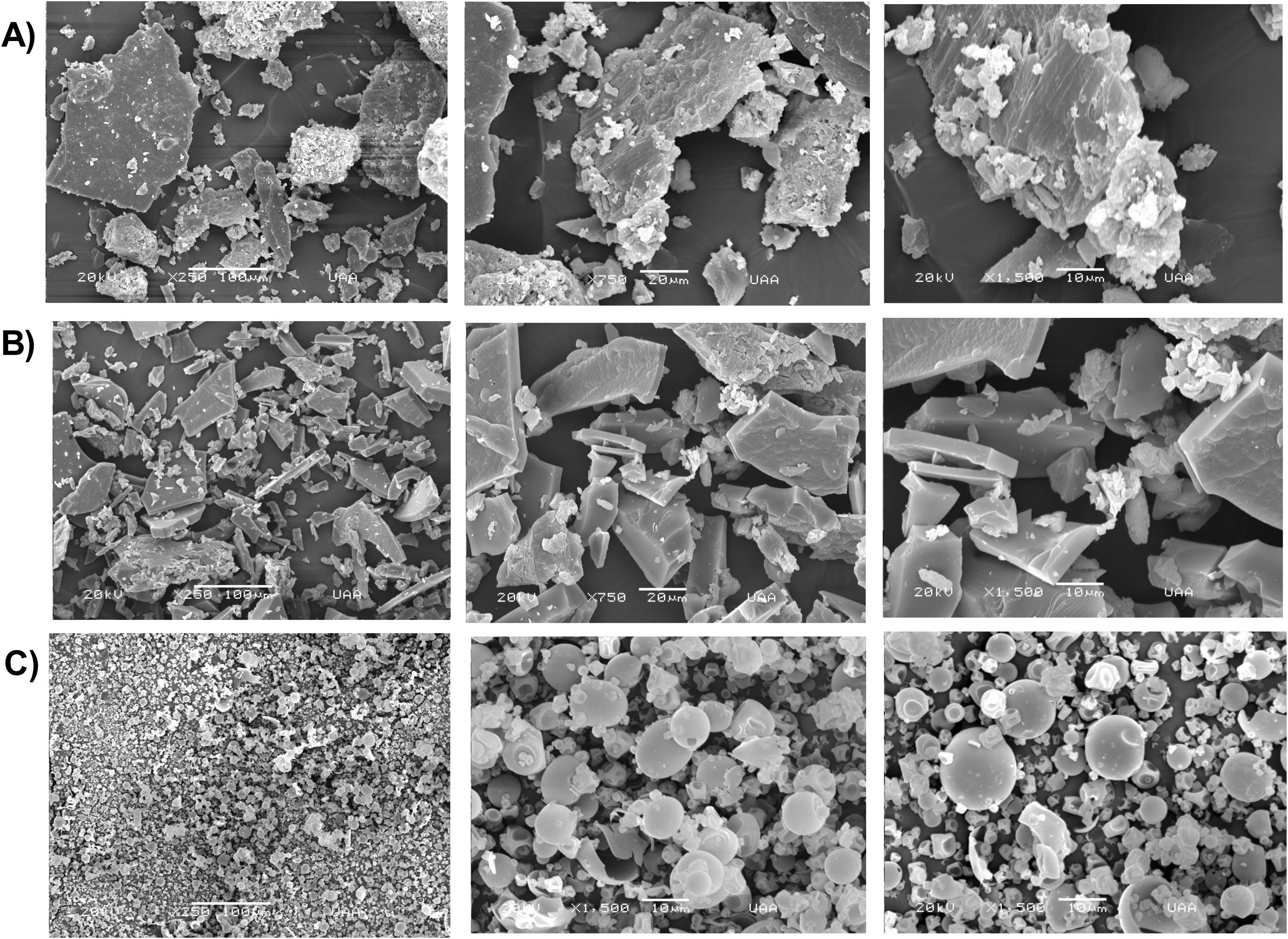 Figure 1. Scanning electron microscopy (SEM) micrographs of: (A) crude guava leaf extract, (B) purified guava leaf extract, and (C) guava leaf extract microencapsulated in β-cyclodextrins.