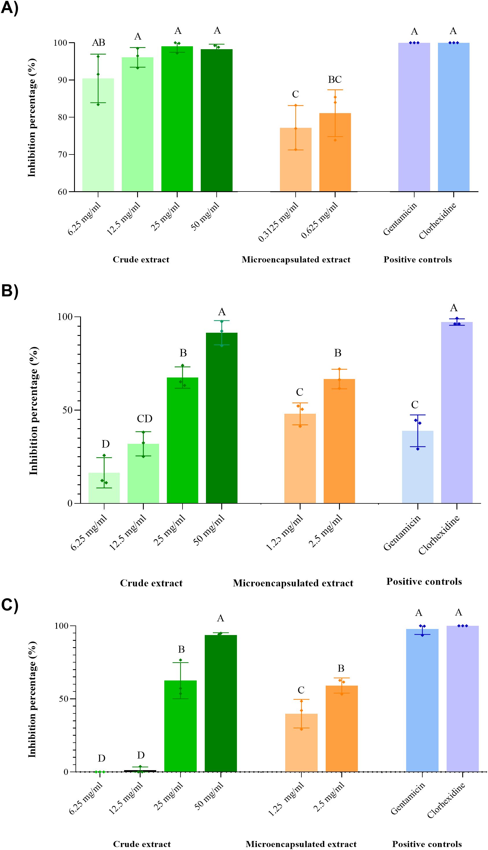 Figure 4. Percentage inhibition of bacterial adhesion at different concentrations of crude and microencapsulated guava leaf extract. (A) S. epidermidis ATCC 12228, (B) Clinical isolate of E. faecalis, (C) E. faecalis ATCC 29212. Groups that do not share a letter are significantly different (p < 0.05).
