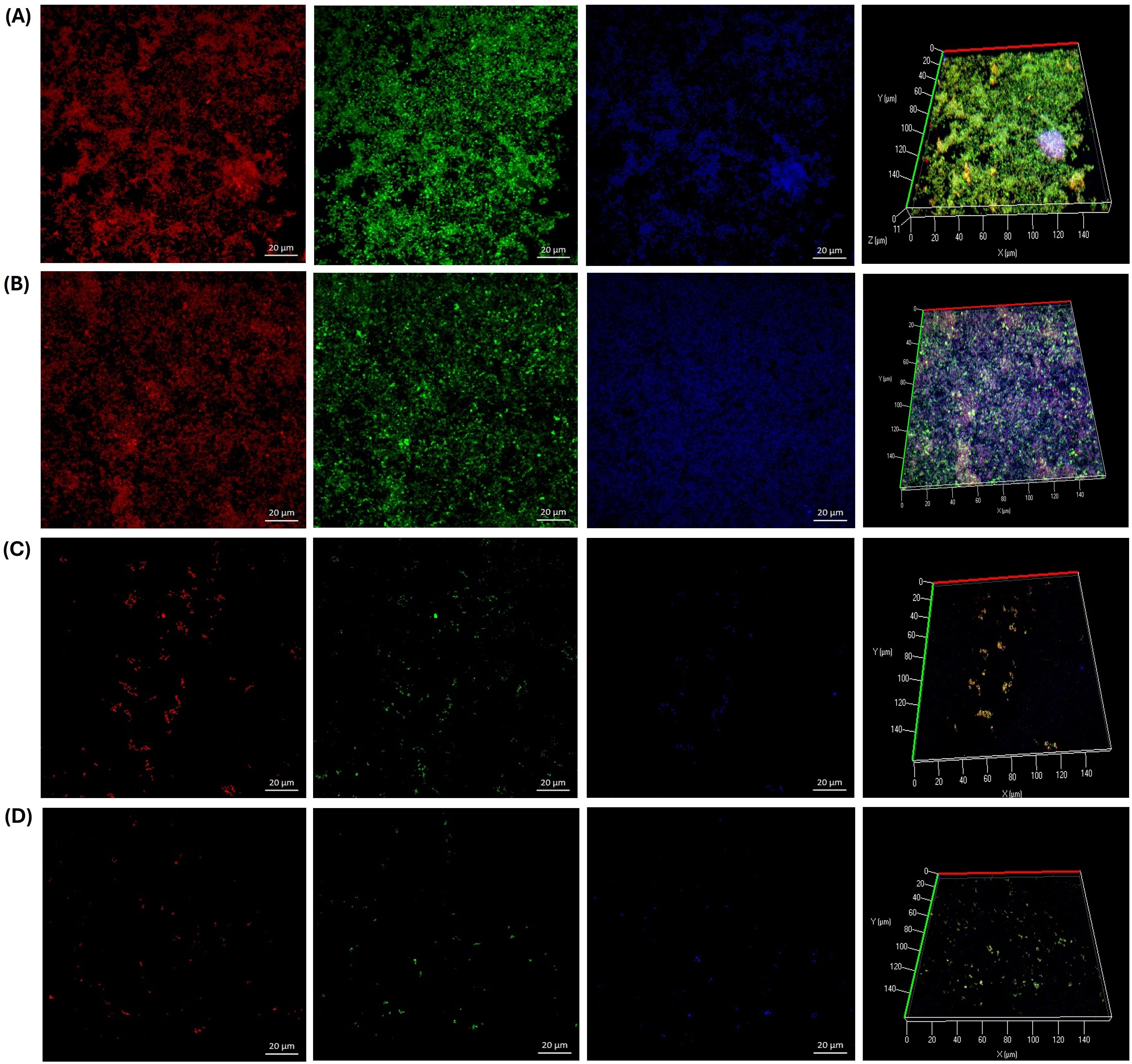 Figure 9. CLSM microscopy of the effect of the guajava leaf extract in the crude (GLE) and microencapsulate (GLEM) form on the extracellular polymeric substance (EPS) of the biofilm of E. faecalis clinical isolate extracellular polymeric substance (EPS) of the biofilm. SYPRO Ruby was used to stain proteins (red), wheat-germ agglutinin (WGA)-Oregon green was used to stain N-acetyl-D-glucosamine and N-acetyl-neuraminic acid residues (green) and eDNA was stained with DAPI (blue). Biofilm development is shown under four conditions: untreated control (A); exposure to crude guava leaf extract at 25 mg/mL (B); exposure to microencapsulated extract at 2.5 mg/mL (C); and treatment with 0.6% chlorhexidine (D).