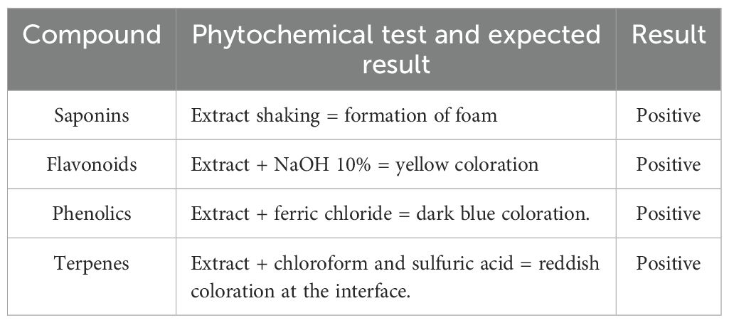 GLE tested positive for all the phytochemical groups analyzed (Table 1). The identification of phenolic compounds in this extract has been corroborated in previous studies using UPLC-MS analysis (Gutierrez Montiel et al., 2023).