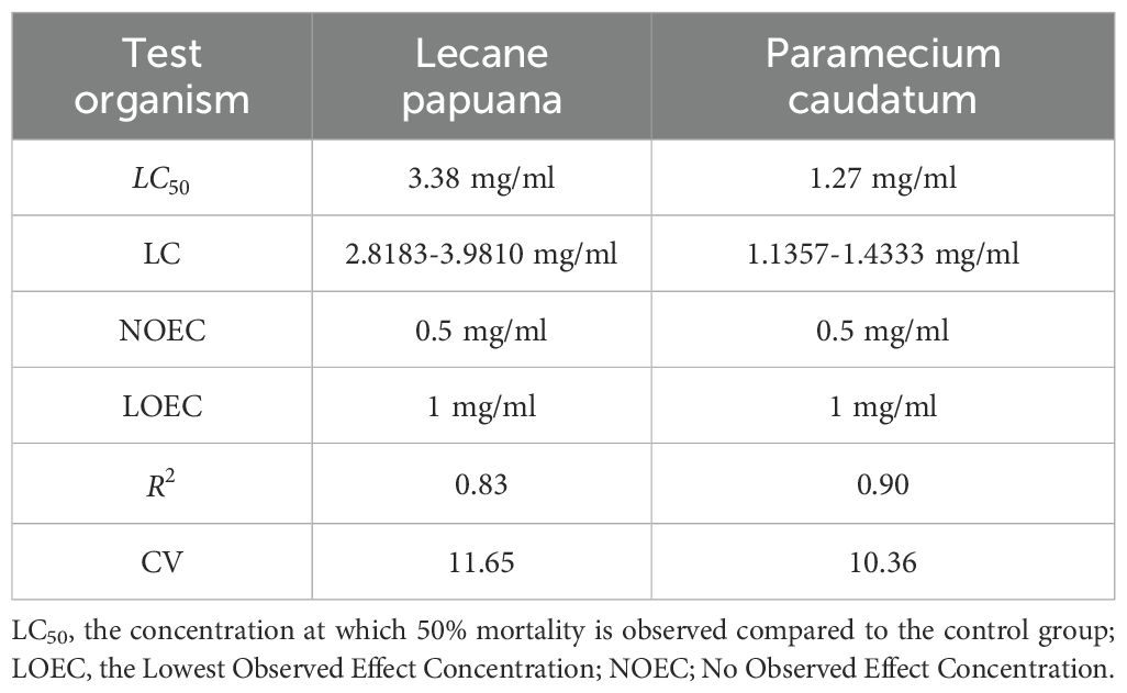 In Lecane papuana, the LC50 was calculated at 3.38 mg/ml, while the no observed effect concentration (NOEC) and the lowest observed effect concentration (LOEC) were 0.5 mg/ml and 1 mg/ml, respectively. In comparison, Paramecium caudatum demonstrated higher sensitivity to the extract, with an LC50 of 1.27 mg/ml. Despite this increased sensitivity, the NOEC and LOEC values for P. caudatum were identical to those of L. papuana, suggesting that although both organisms begin to exhibit adverse effects at similar concentrations, P. caudatum is more severely affected as the dose increases.