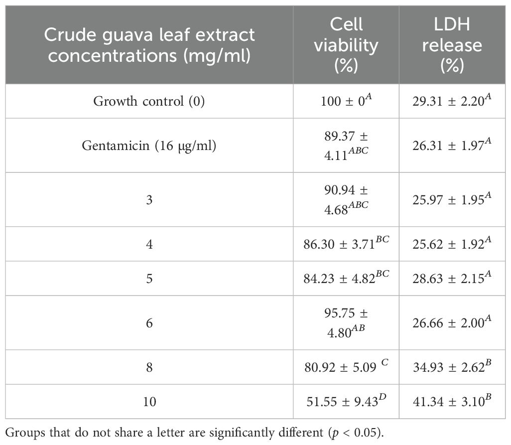 Table 5. Cell viability (%) and LDH release (%) in Vero-76 cells treated with crude guava leaf extract.