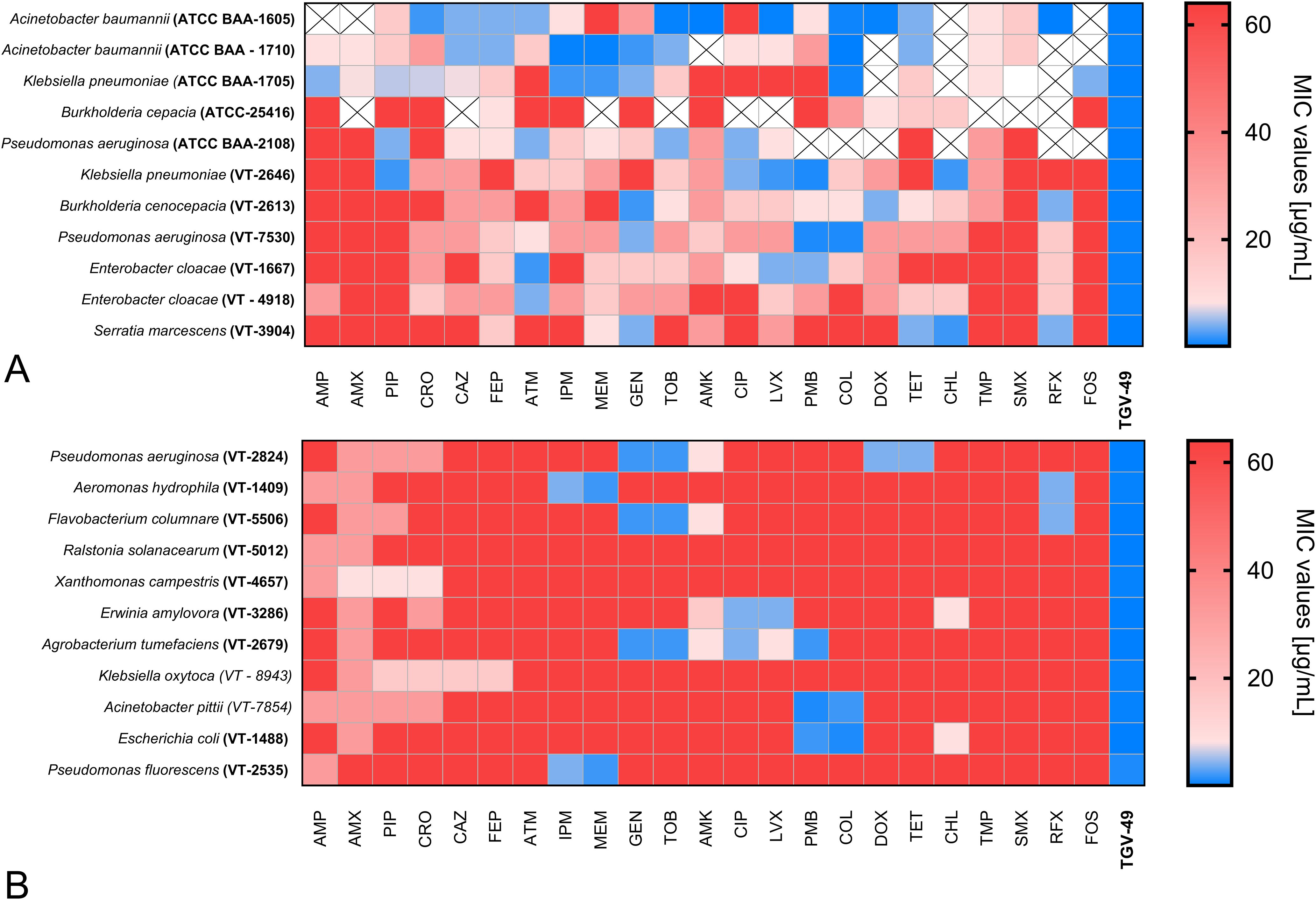 Figure 2. Antibiotic susceptibility of Gram-negative bacteria to TGV-49 and conventional antibiotics. The heatmap illustrates the antibiotic susceptibility of various Gram-negative bacterial (A) human pathogens and (B) plant and fish pathogens. The antibiotics tested against the particular bacterial strain are listed at the bottom of the heatmap. The color range reflects the MIC values (µg/mL); blue represents lower MIC values, while red represents higher MIC values (corresponding to higher resistance). The “cross” states that a particular pathogen was not tested against that particular antibiotic. Antibiotic AMP, Ampicillin; AMX, Amoxicillin; PIP, Piperacillin; CRO, Ceftriaxone; CAZ, Ceftazidime; FEP, Cefepime; ATM, Aztreonam; IPM, Imipenem; MEM, Meropenem; FOS, Fosfomycin; GEN, Gentamicin; TOB, Tobramycin; AMK, Amikacin; CIP, Ciprofloxacin; LVX, Levofloxacin; PMB, Polymyxin B; COL, Colistin; DOX, Doxycycline; TET, Tetracycline; CHL, Chloramphenicol; TMP, Trimethoprim; SMX, Sulfamethoxazole; RIF, Rifaximin.