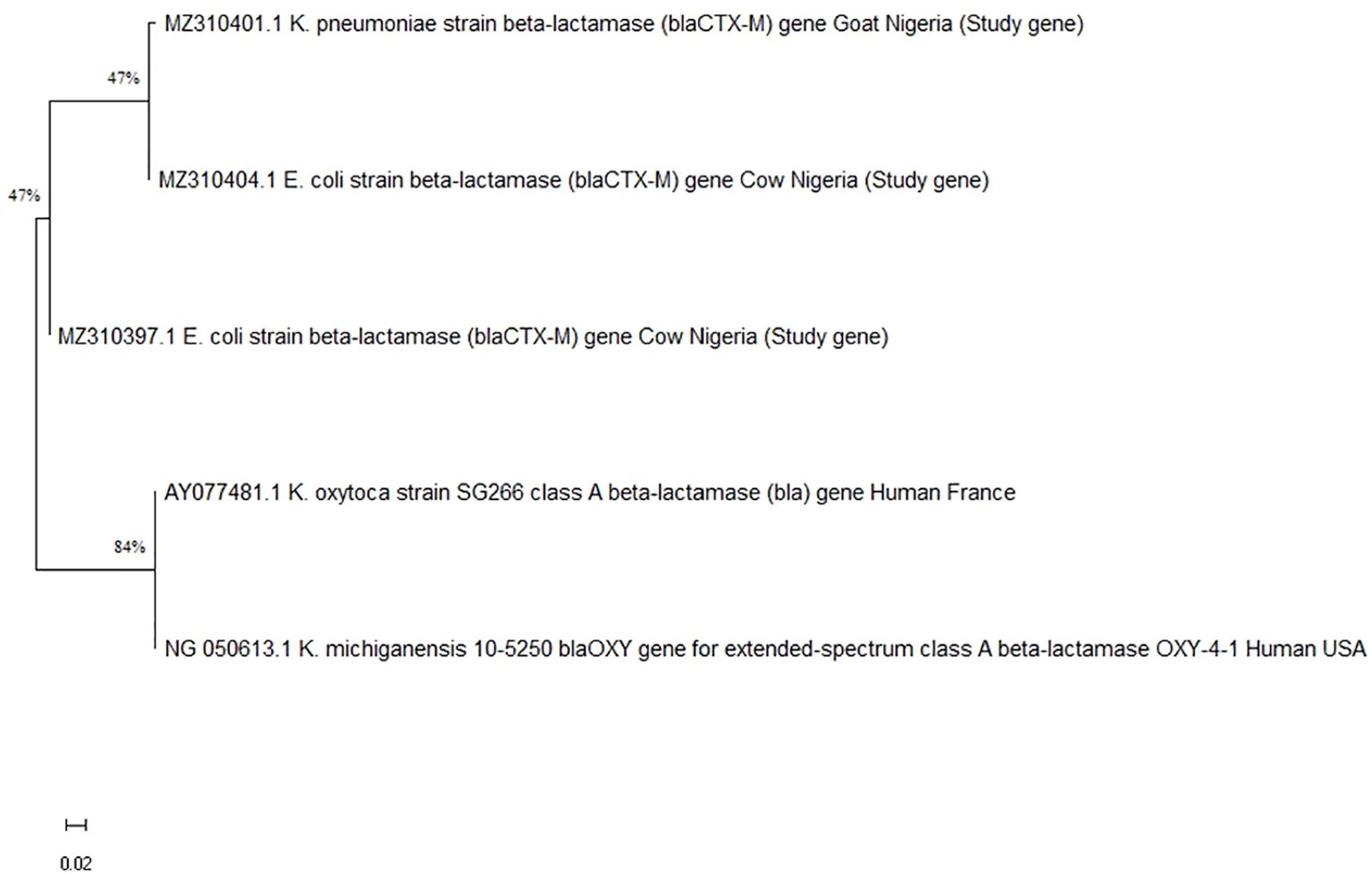 Figure 2. Phylogenetic tree showing the genetic relationship of various beta-lactamase genes. Branches indicate strains: K. pneumoniae from goat, E. coli from cows, and K. oxytoca and K. michiganensis from humans, with bootstrap values of fortyseven and eighty-four percent.