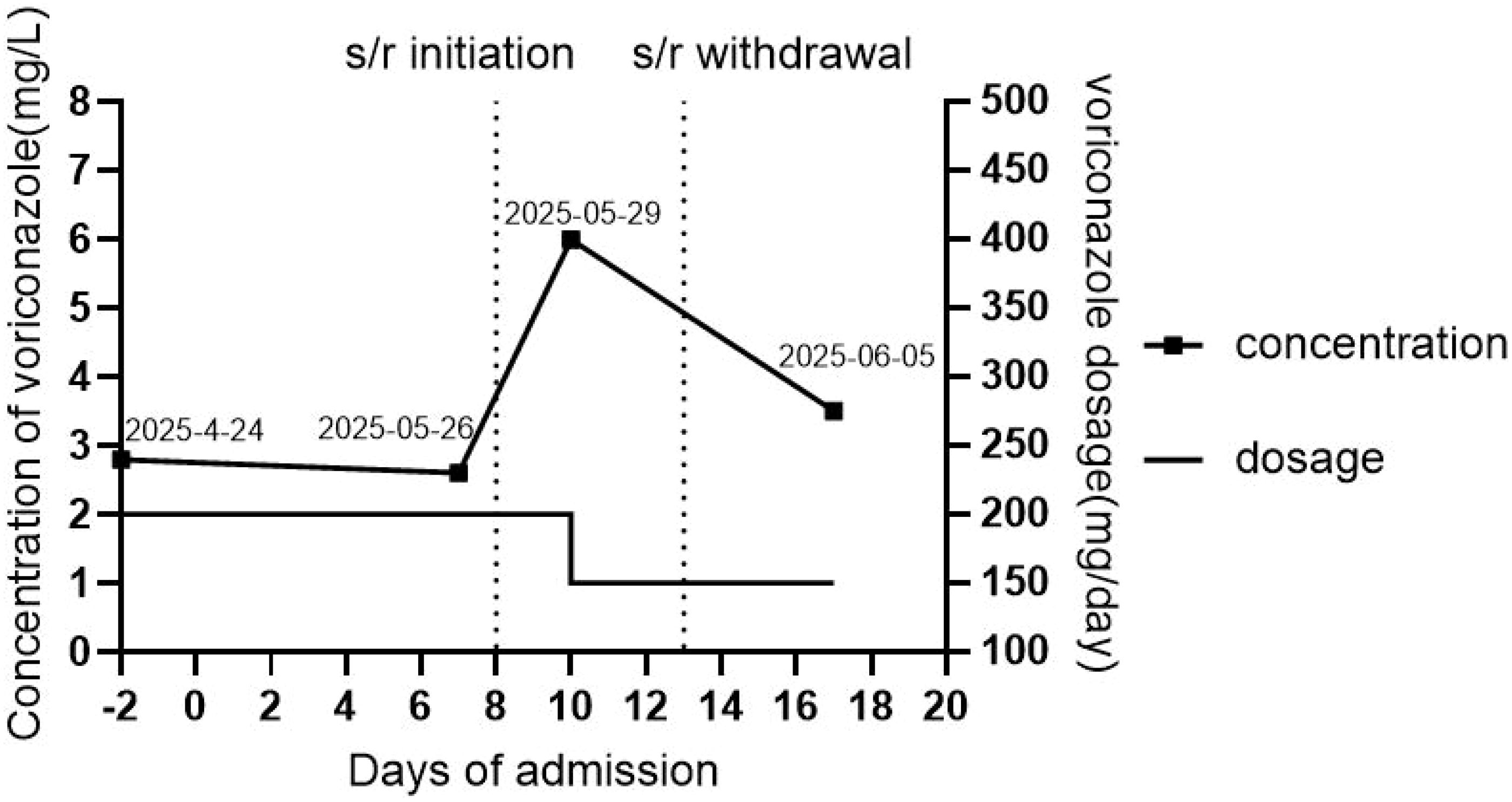 During the current admission, oral voriconazole (200 mg q12h) was continued for antifungal treatment. The initial voriconazole trough concentration, measured using the enzyme-multiplied immunoassay technique (EMIT) 30 min prior to the fifth dose (April 19, 2025), was 2.8 mg/L. A repeated voriconazole trough concentration on May 26 was 2.6 mg/L. On May 27, the patient experienced increased wheezing. Arterial blood gas analysis showed: pH, 7.415; PaCO2, 51.3 mmHg; PaO2, 65.9 mmHg; and SpO2, 93.8%. A SARS-CoV-2 nucleic acid test was positive, and oral simnotrelvir/ritonavir (750 mg/100 mg every 12 h) was started for antiviral treatment. Later that day, the patient’s wheezing worsened and SpO2 decreased to approximately 85%. Accordingly, meropenem 1 g q8h was added empirically. On May 29, the voriconazole trough concentration increased to 6.0 mg/L, leading to a dose reduction to 150 mg q12h orally. No adverse drug reactions were observed at this elevated concentration. The simnotrelvir/ritonavir regimen was completed on May 31 after a 5-day course. By June 5, a week after voriconazole dose reduction (4 days after simnotrelvir/ritonavir withdrawal), the voriconazole trough concentration decreased to 3.5 mg/L. On June 10, the patient maintained SpO2 above 97% with noninvasive ventilation, showed no dyspnea at rest, and remained afebrile. Meropenem was discontinued after a 14-day course of therapy, with the absence of identified pathogens. The patient was discharged accordingly. Figure 1 shows the serial changes in the trough concentrations of voriconazole in this patient.