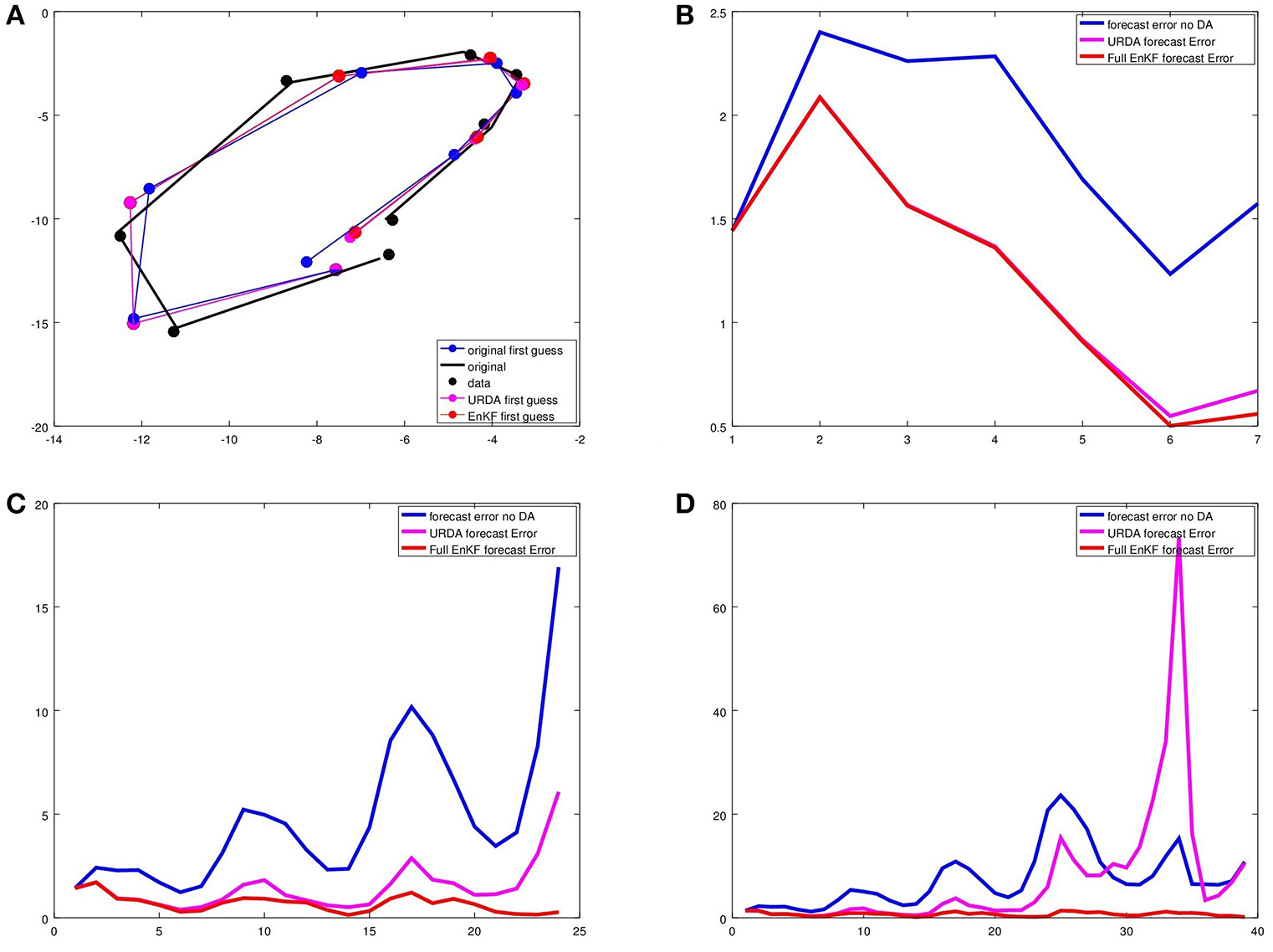 Figure 2. We show the results of the ultra rapid data assimilation in comparison with the ensemble Kalman square root filter for the Lorenz 1963 model for N = 8 assimilation steps. In (A), the black curve is the original, black dots are the observations. The mean of the analysis ensemble of the ultra rapid data assimilation URDA after k = 8 assimilation steps is shown in pink, where we need to note that here the information of the data is used to update the full curve at all points (i.e., the estimate of the past is updated as well. The red curve shows the analysis ensemble mean of the sequential ensemble Kalman square root filter. (B–D) show the sequential error curves of the analysis error, pink for URDA, red for the ensemble Kalman square root filter.