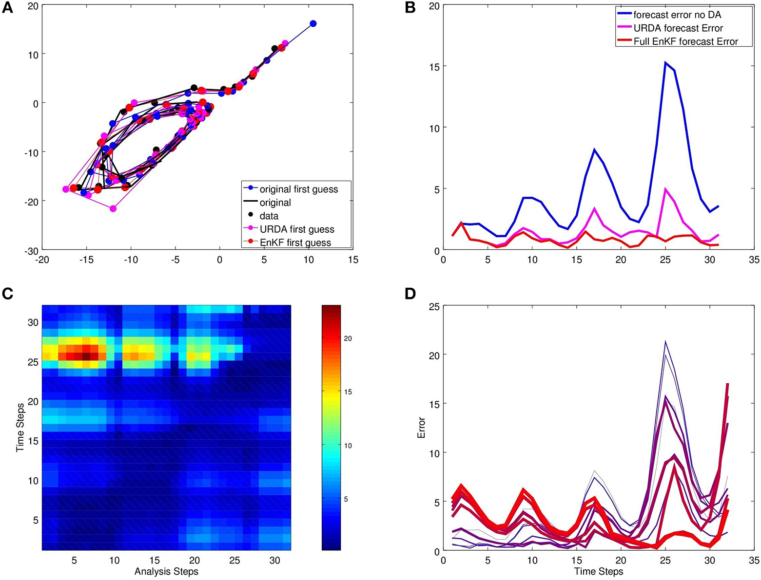 Figure 3. Studying the results of the ultra-rapid ensemble smoother over N = 32 assimilation steps. (A) shows the original data and the first guess of the Kalman filter analysis cycle. The corresponding first guess error is compared in (B). (C,D) show the error of the full ultra-rapid ensemble analysis for the full time-scale between t0 and tN for N = 32 time steps. In (D) we display the error for the curves t1, t4, t7, …, t31, starting with a thin blue curve and ending with a thick red curve.