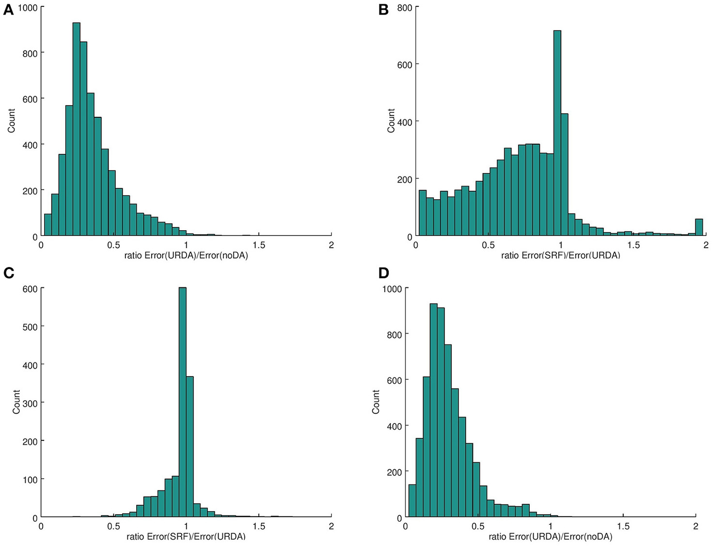 Figure 4. We show the results of the mean-error of the ultra rapid data assimilation in comparison with the original first guess (no data assimilated) and the ensemble Kalman square root filter for the Lorenz 1963 model. We used Nstat = 250 different initializations of the random number generator to obtain different distributions for the observations and the initial ensemble. After assimilation of all data the mean error at each time step on the trajectory from the truth is counted. In (A,B) we used L = 5 and N = 25 to obtain histograms showing in (A) the ratio of the mean-error of URDA divided by the mean-error of the model forecast without data assimilation. For L = 5 in (B) the mean-error of the SRF divided by the one of URDA is displayed for N = 25 while the same is shown for N = 8 in (C). The ratio of the mean-error of URDA divided by the initial forecast for N = 25 and L = 25 in (D).