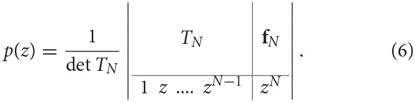 where is the Toeplitz matrix, is the vector of polynomial coefficients and is a column vector of some additional samples of f with f(n) = fn for all n ∈ ℤ. Analogically one can write the Prony polynomial in the determinant form as