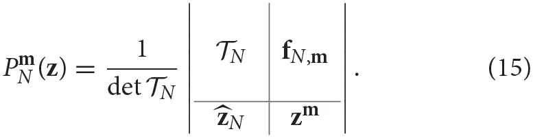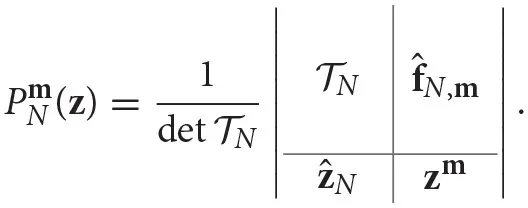 Let us consider the determinants of type I. We assume that for some q ≠ p, 0 ≤ q, p ≤ N, some indices iq and ip coincide, for example, . In this case the determinant vanishes, namely Consequently, in the representation (16) nonzero terms are just determinants with pairwise distinct ik, k = 1, …, N. Hence, Let us consider the value for some fixed parameter zj, 1 ≤ j ≤ N, using (17). Since all the indices i1, …iN also run from 1 to N, the index j of the parameter zj must coincide with some index is, 0 ≤ s ≤ N, and it results in the vanishing of , since As the multidegree m = (m1, m2) ∈ DN, the polynomial and the parameter zj were arbitrarily chosen, it follows that Prony-type polynomials vanish at the points z1, z2, …, zN, namely , for all zj, j = 1, …, N, and for all m ∈ DN.