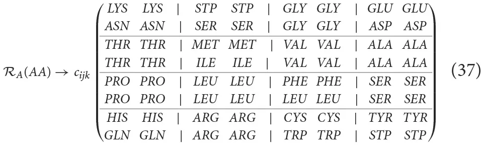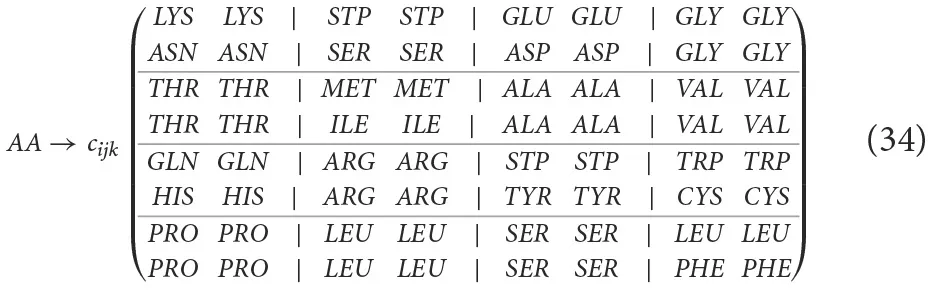 In agreement to Equations 31, 32, the complete representation of the genetic code is given by expression (Equation 33), and the corresponding amino acid matrix is given by Equation 34.