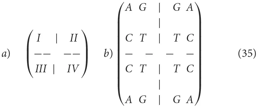 In this algebraic framework, linear transformations may be applied to the matrix without affecting its underlying properties (Equation 35B). Preserving the arrangement of the first block, reflections can be performed on the first and second nucleobases to generate the elements of the second, third, and fourth major blocks (Equation 35A). Biologically, this represents transitions or transversions between nucleobases.