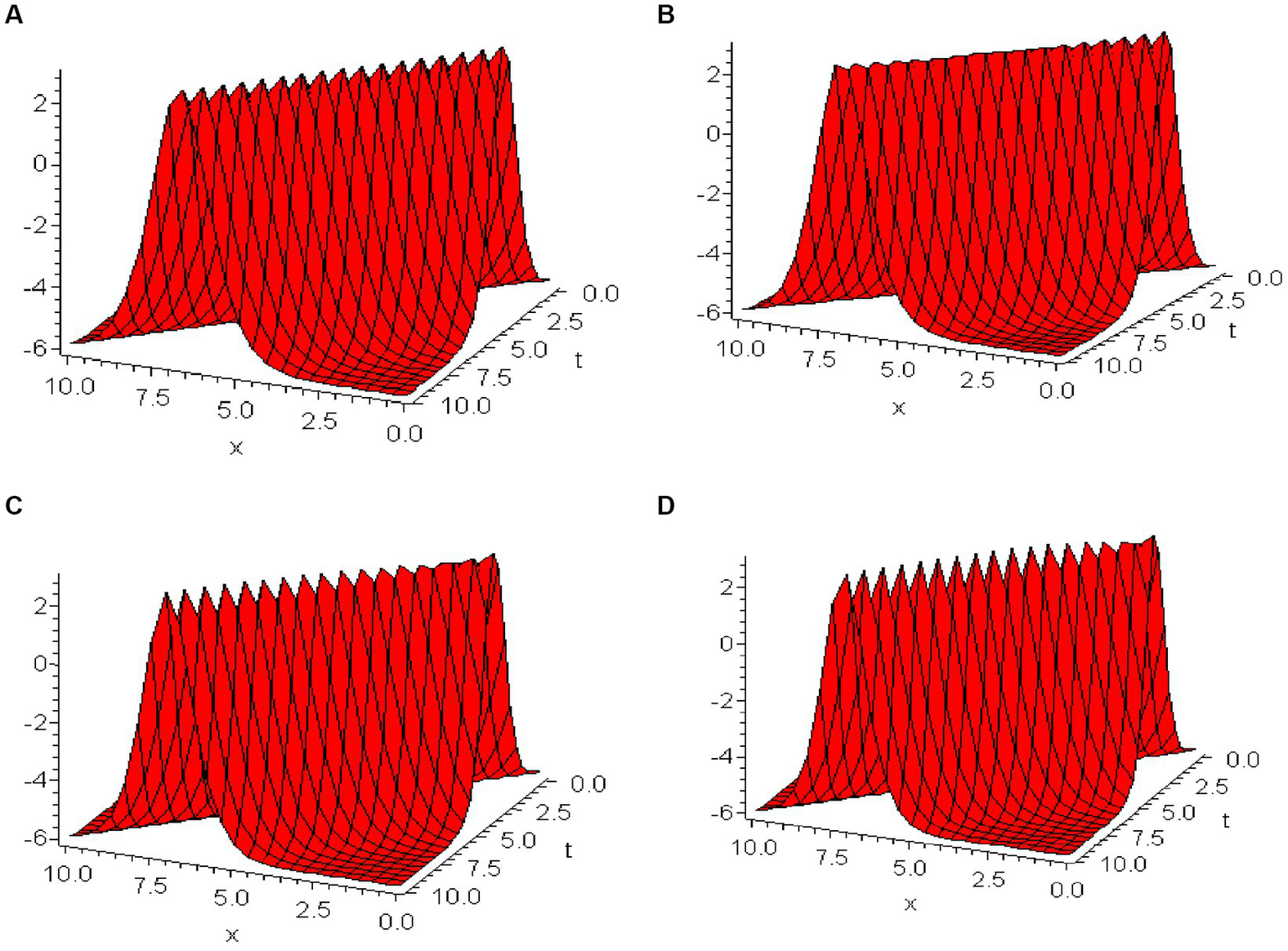 In exploring the dynamic features of nonlinear wave propagation as delineated in Eq. (30) and Figure 2 illustrates the 3D graphical depictions of the wave solutions for , constructed under parameters set at and over a domain where . Noteworthy within these illustrations is the depiction of solitary wave solutions at different values—specifically and corresponding individually to Figure 2A–D. A clear pattern that emerges from Figure 2 is the direct relationship between values and the resultant wavelength; an increment in is associated with an increase in the wavelength. Concurrently, a diminutive trend in amplitude is noted as decreases from 1 to 0.94.