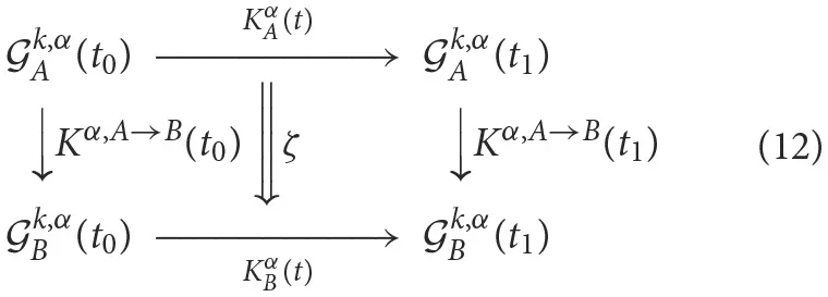 Before moving to Section 3, we show here a basic example of categorical thinking. Let us denote as A, B two patients with similar symptoms, which can be related to the same disease α. Let be the brain network of the first patient at the baseline and at the first follow-up. The disease progress can be described as: