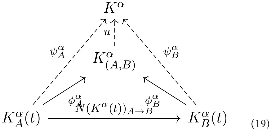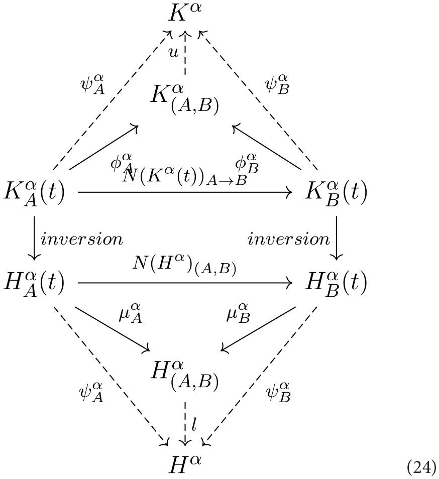 Diseased people are real, and diseases are abstractions. The “disease” in a person is the embodiment of the idea of disease. Such an idea can be thought of in terms of a categorical structure, the colimit. A colimit is a “universal object” formalizing the intuition of the most general way to connect elements, generalizing the notion of direct sum or union [9]. We can sketch the categorical structure of the colimit for a single disease, let it be α. Treating the transformations K as points themselves, we can write: